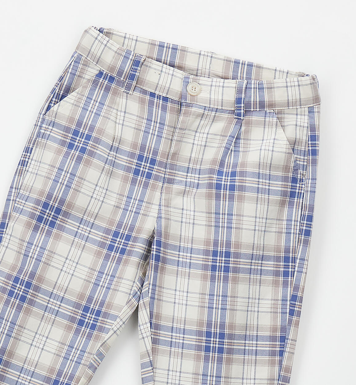 Sarabanda boys' long trousers made of 100% cotton with a check pattern. Turn-ups at the bottom of the leg. Zip and button fastening. Adjustable waist with internal elastic loop. Carrot fit.