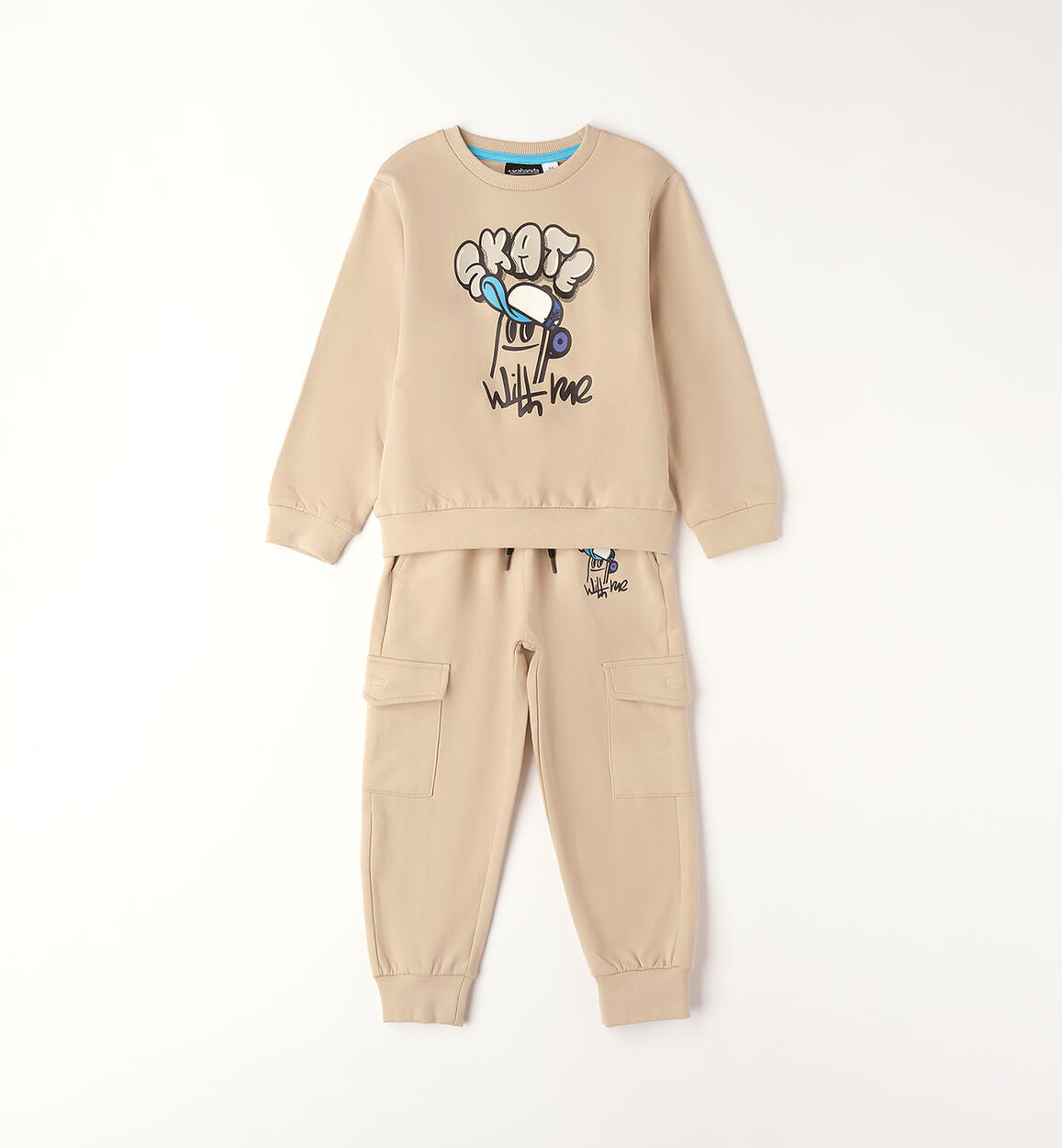 Sarabanda two-piece tracksuit for boys made of 100% cotton fleece. Crewneck sweatshirt with skate-themed print. Pants with side pockets, elastic waistband with drawstring, and cuffs at the bottom of the leg. Regular fit.