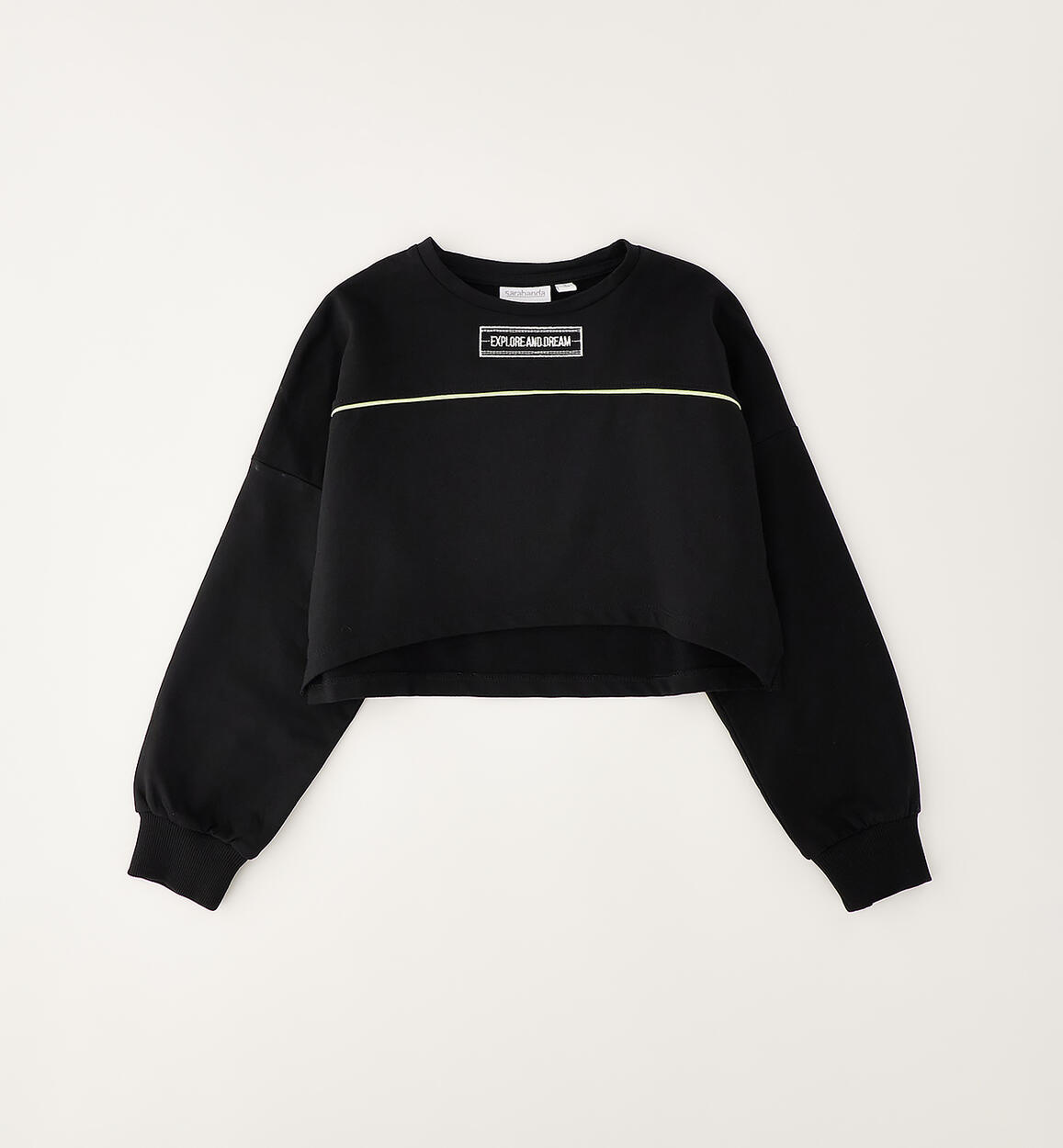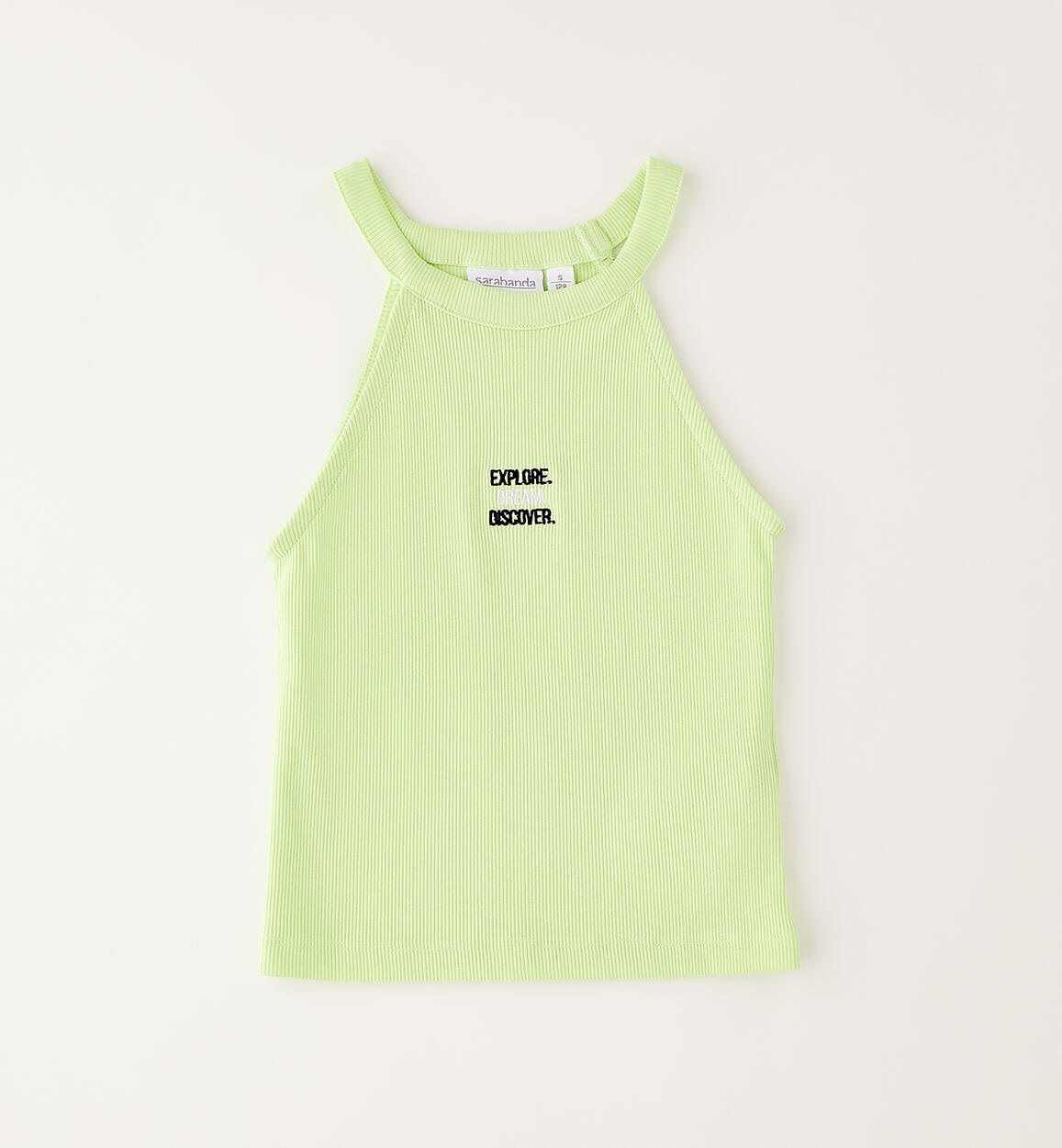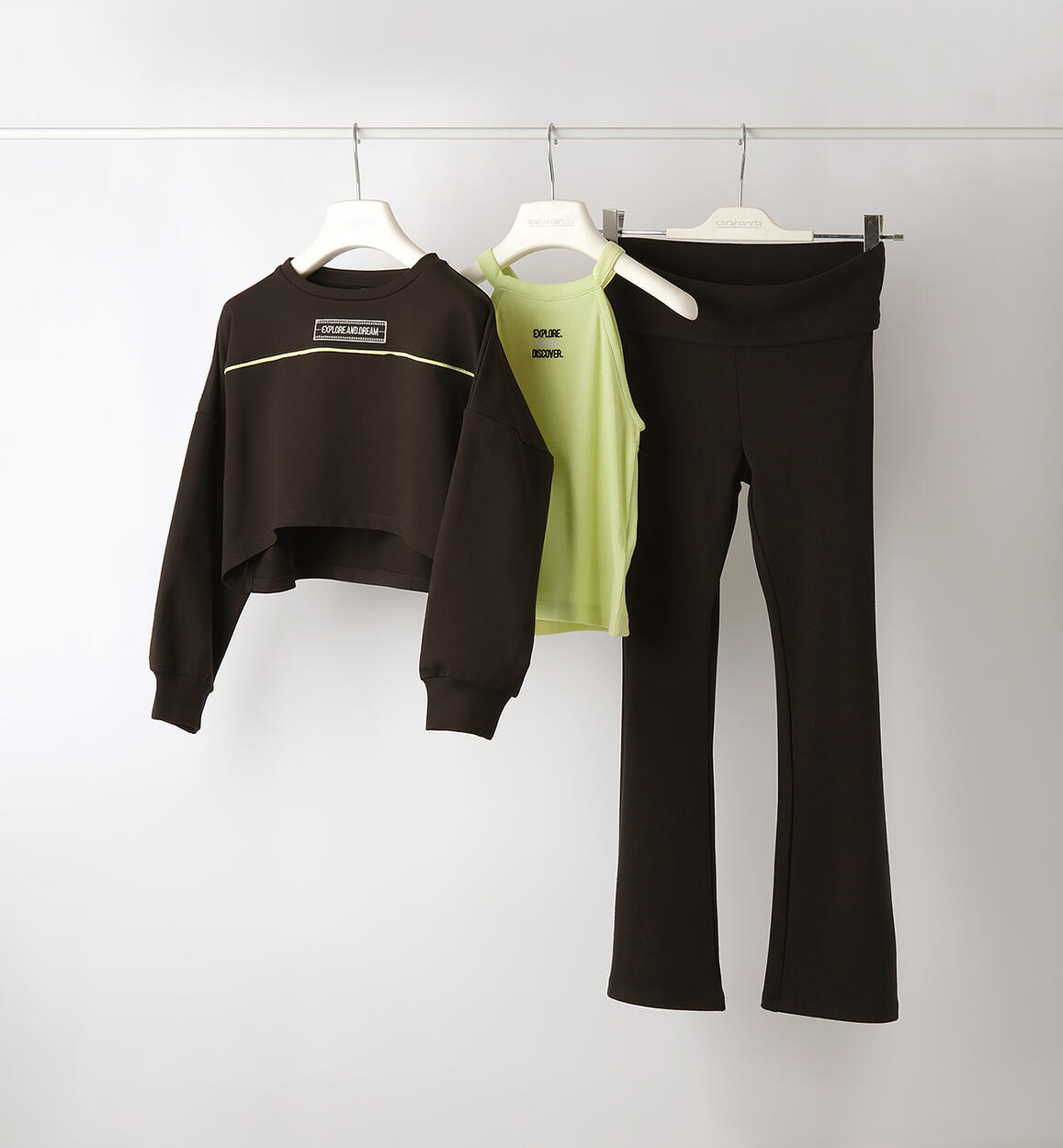 Sarabanda three-piece outfit for girls. Cropped sweatshirt made of cotton French terry. Ribbed tank top with front embroidery. Ribbed trousers with flared bottoms and cuffed waist.Composition