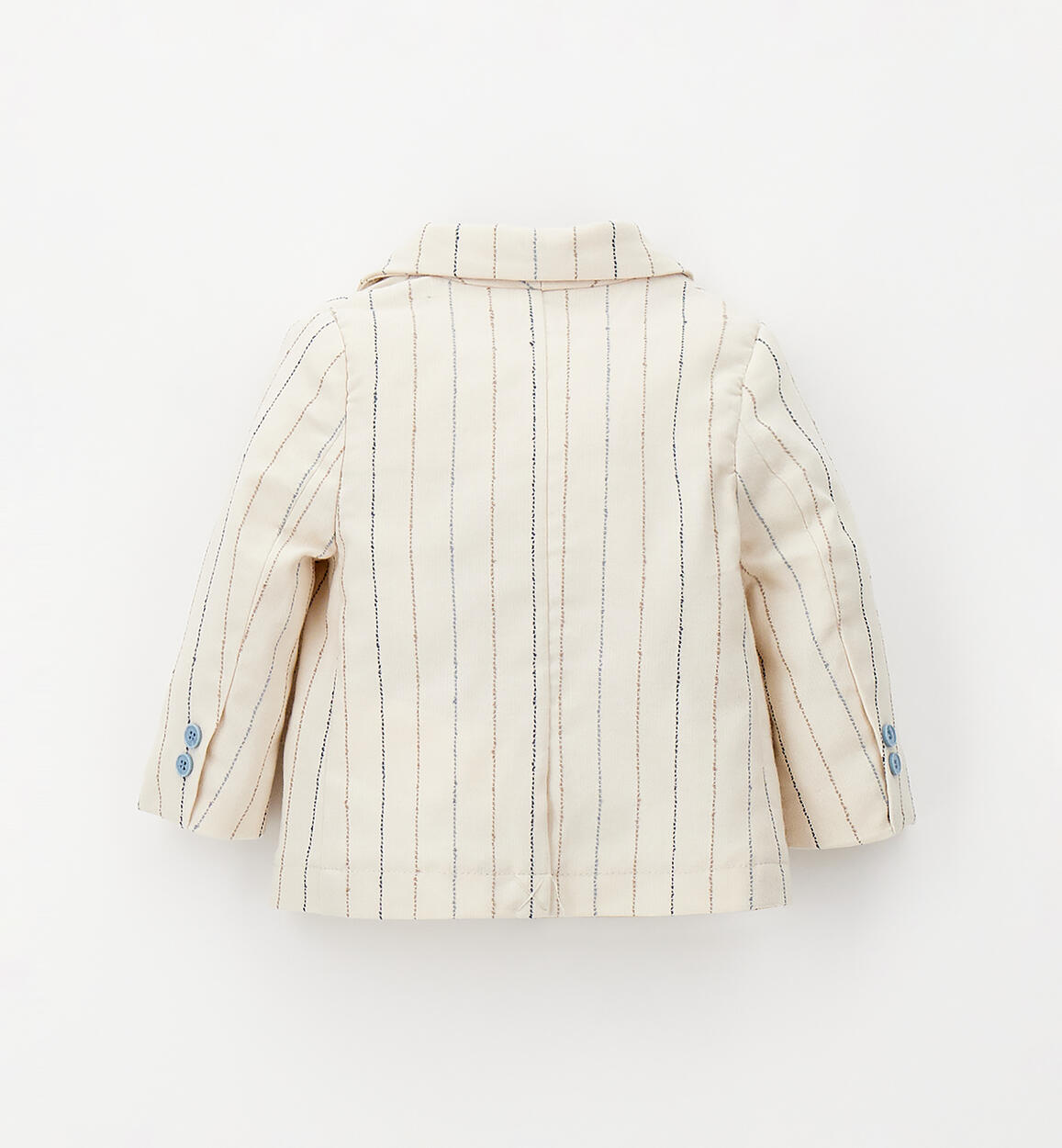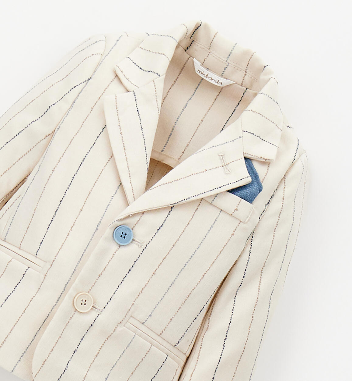 Minibanda elegant jacket for newborns made of embroidered striped fabric. It opens with two-tone buttons. A pouch sewn onto the fake pocket.