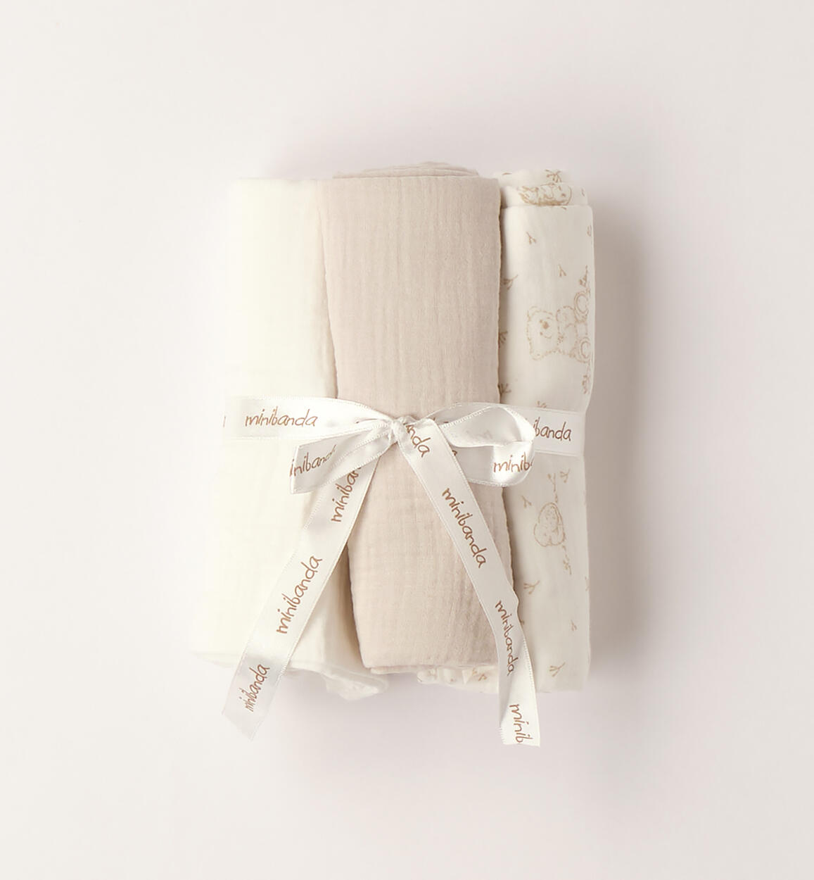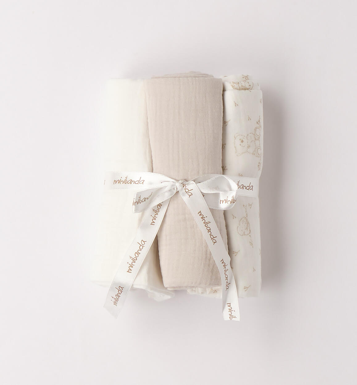 Minibanda's set of three lightweight, 100% cotton muslin blankets for newborns, unisex. Practical and compact, they make a perfect gift. These versatile muslin blankets can be used not only as lightweight blankets, but also as bath towels, discreet protection during breastfeeding, multipurpose towels, or bibs. They measure 70 cm x 70 cm. By choosing our cotton products, you support Minibanda's commitment to the Better Cotton mission. This product is supplied through a mass balance system and may not contain Better Cotton. Learn more at bettercotton.org/massbalance