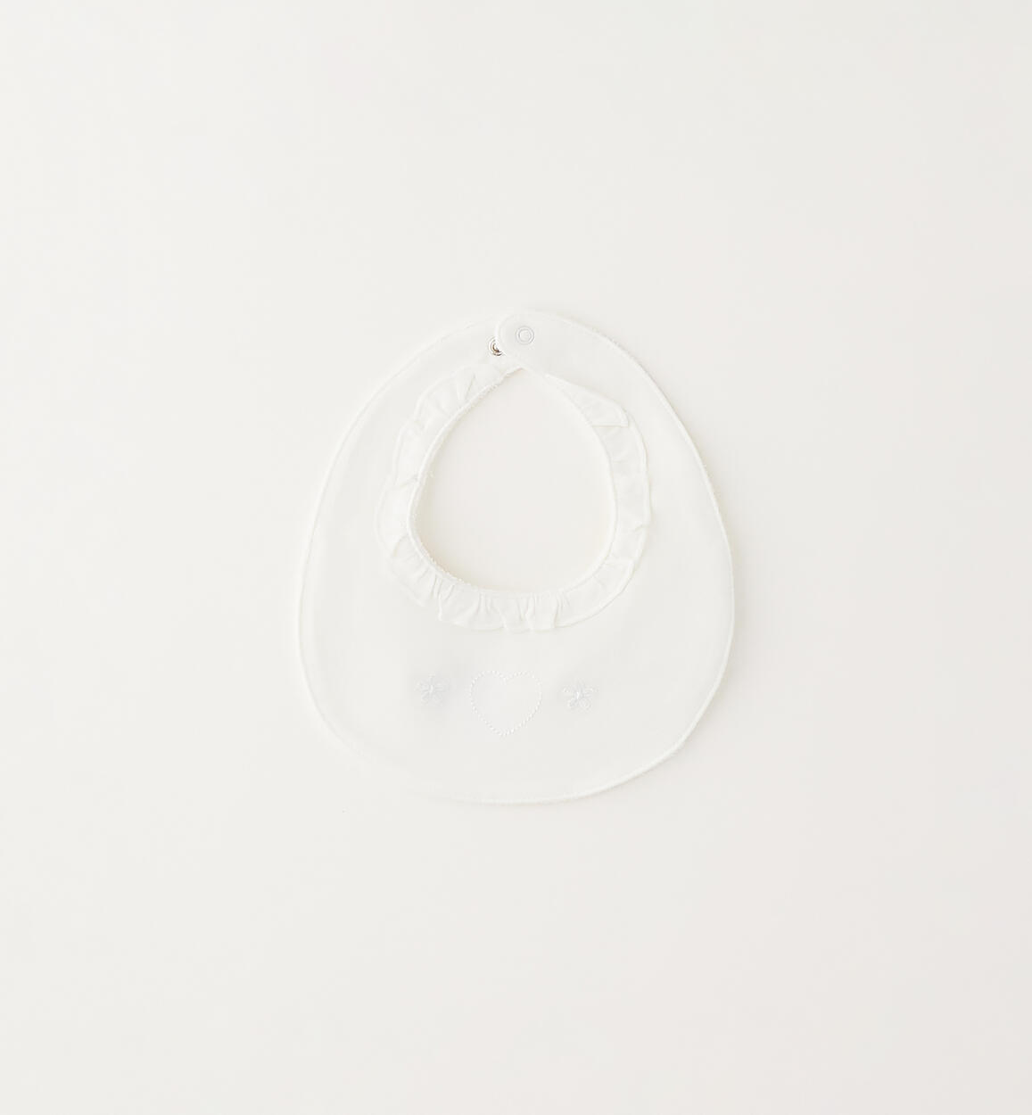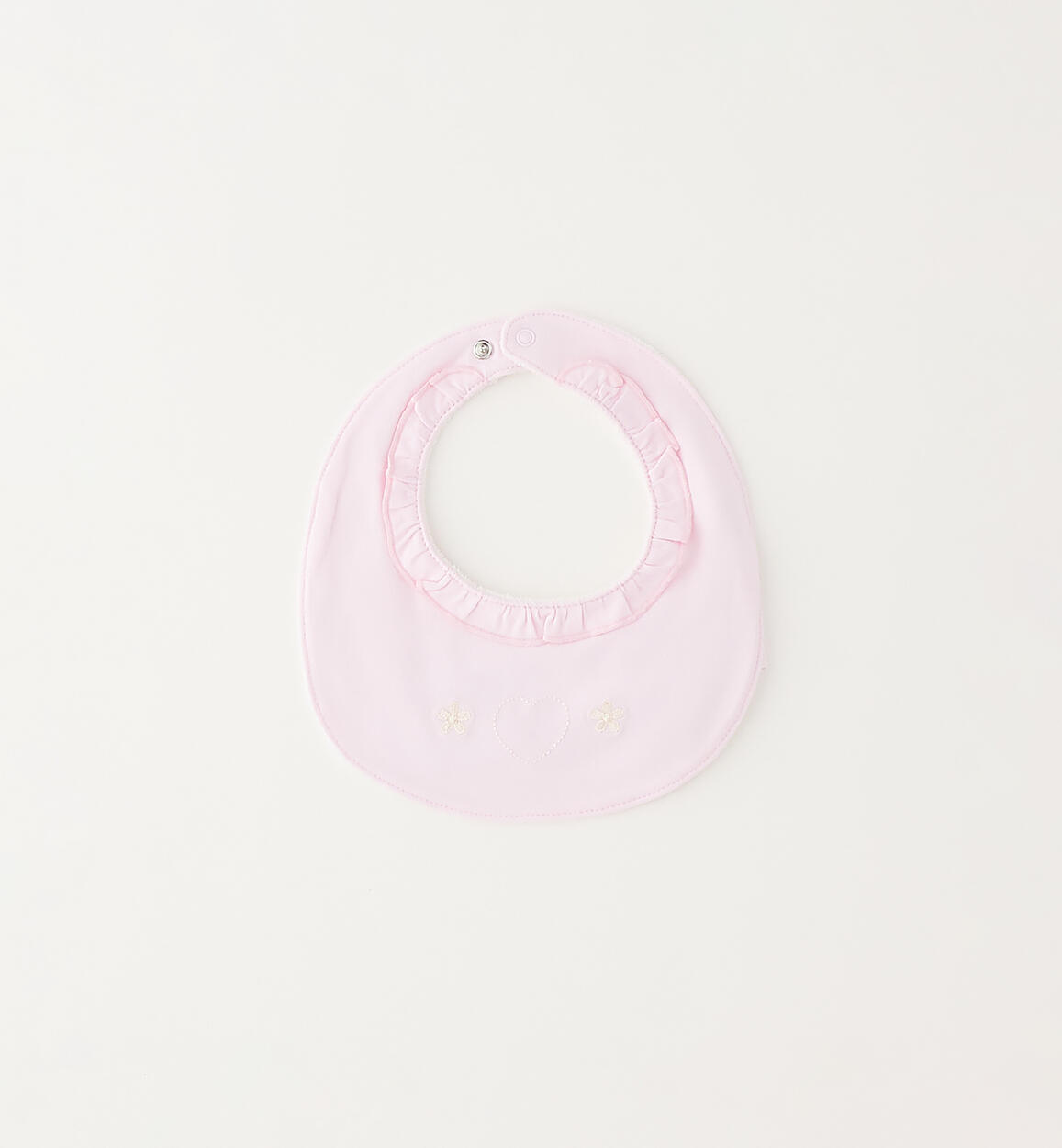 Minibanda baby bib made of stretch cotton jersey with a terry cloth backing. The front is embellished with ruffles and embroidery. Adjustable snap closure. By choosing our cotton products, you support Minibanda's commitment to the Better Cotton mission. This product is supplied through a mass balance system and may not contain Better Cotton. Learn more at bettercotton.org/massbalanceComposition
