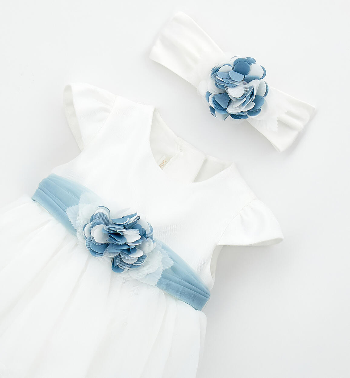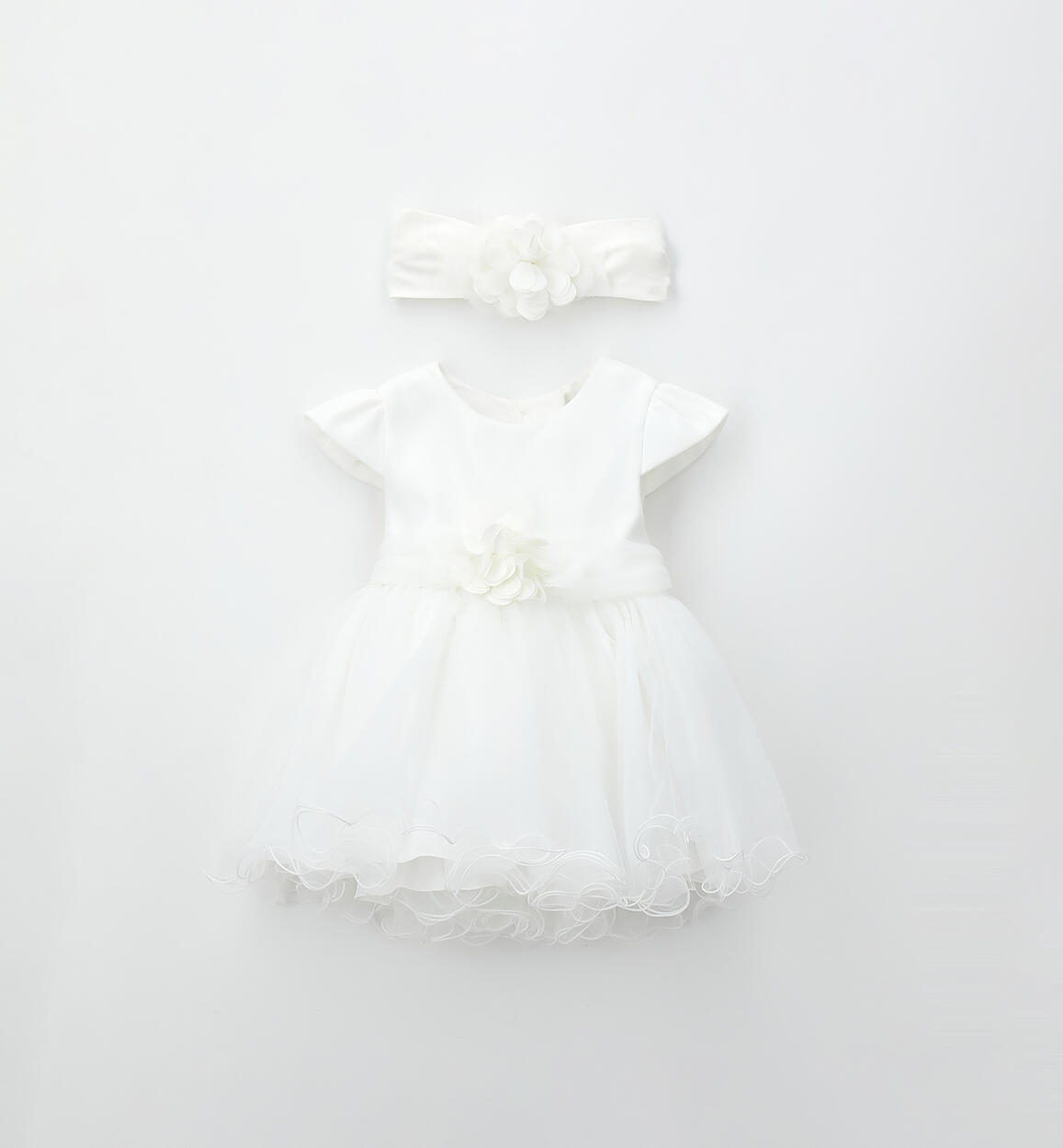 Minibanda baby girl's christening dress made of soft tulle with a cotton lining. It opens at the back with an invisible zip. Knee-length. Matching cotton jersey waistband and headband.Composition