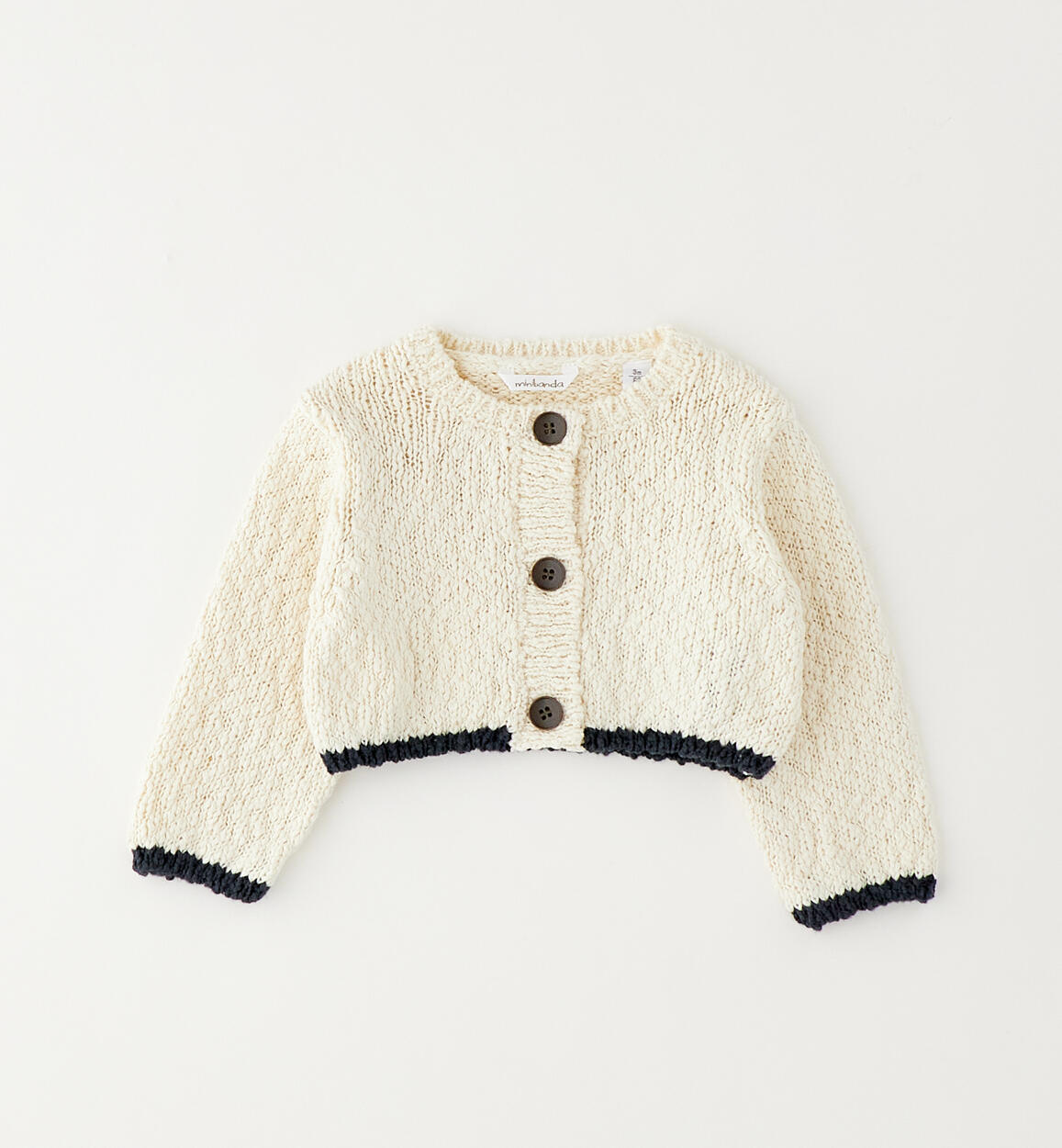 Minibanda baby girl's cardigan made from a special 100% cotton tricot with a button fastening and contrasting details. By choosing our cotton products, you support Minibanda's commitment to the Better Cotton mission. This product is supplied through a mass balance system and may not contain Better Cotton. Learn more at bettercotton.org/massbalance