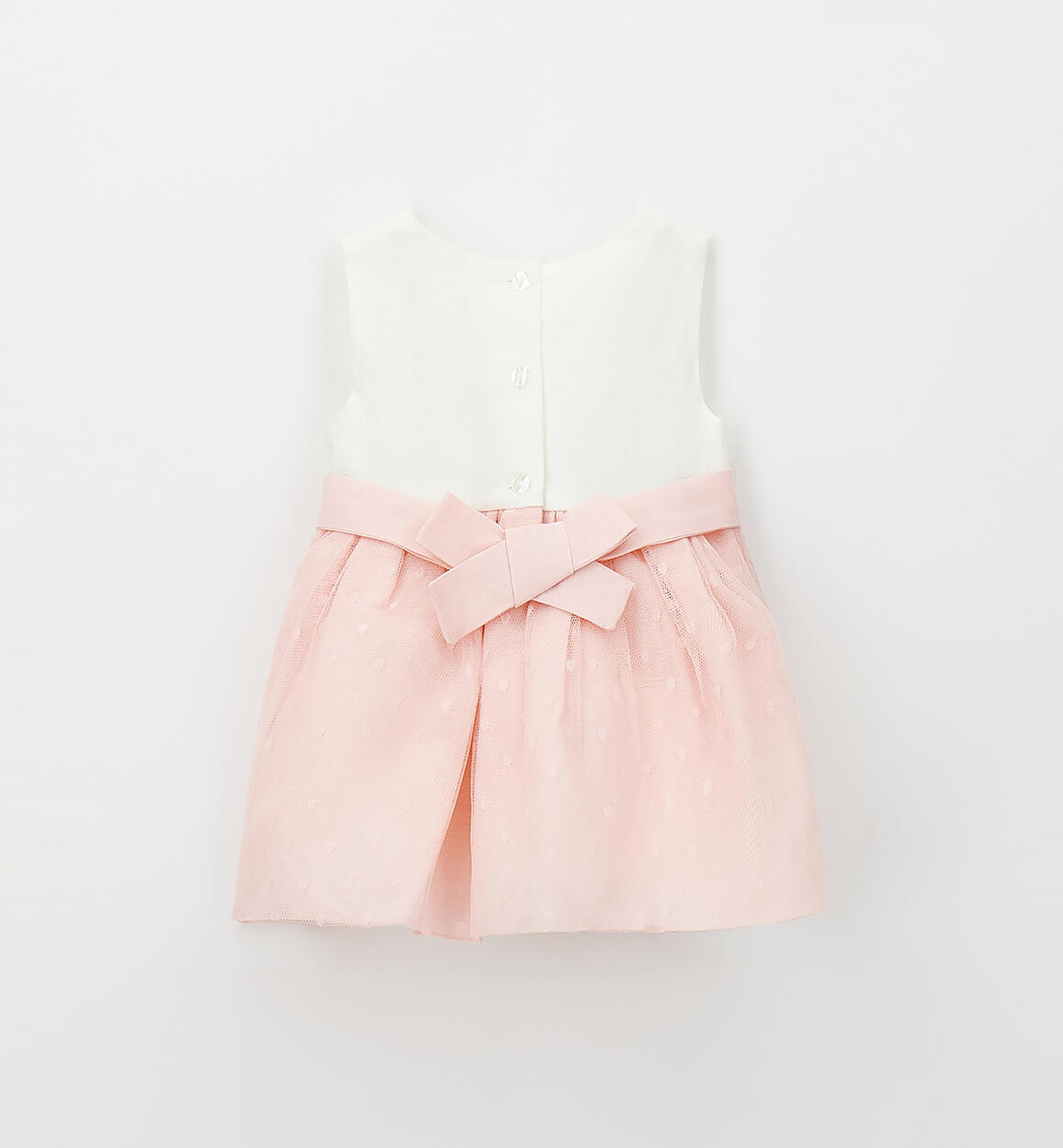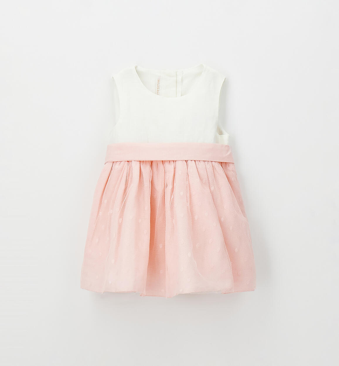 Minibanda elegant sleeveless dress for newborns made of linen and cotton with a polka dot embroidered tulle skirt. Cotton lining. Knee-length. Button-back opening and belted waist.