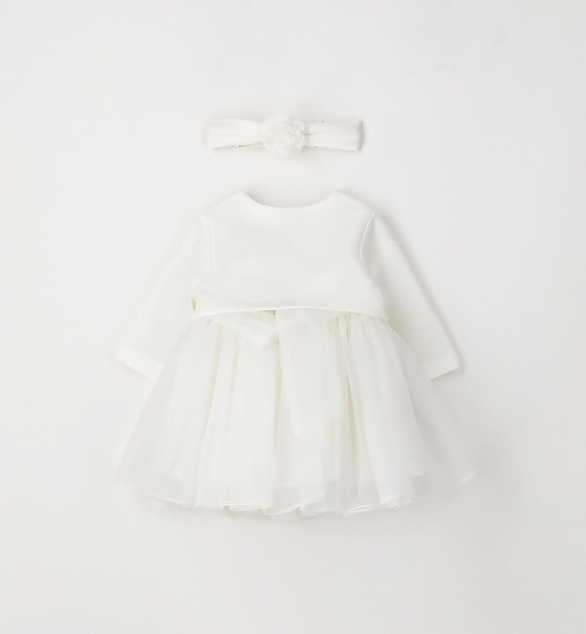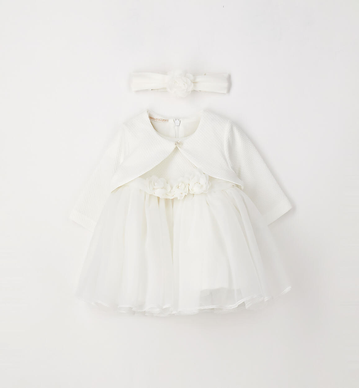Elegant Minibanda baby girl dress, ideal for a baptism. Made with a pique top and tulle skirt, cotton lining. Back opening with an invisible zip. Knee-length. Belted waist. Matching pique shrug and cotton jersey headband.Composition