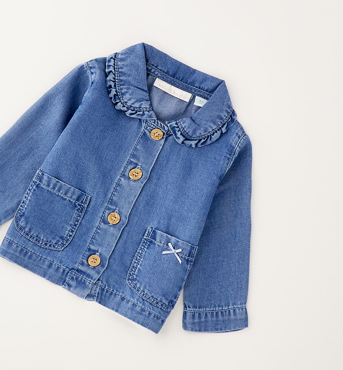 Minibanda long-sleeved shirt for newborns made of 100% lyocell. Front pockets with small bow appliqué. Ruffled collar. Front button closure.
