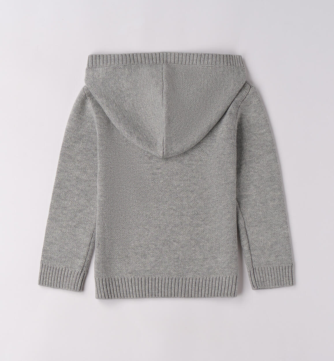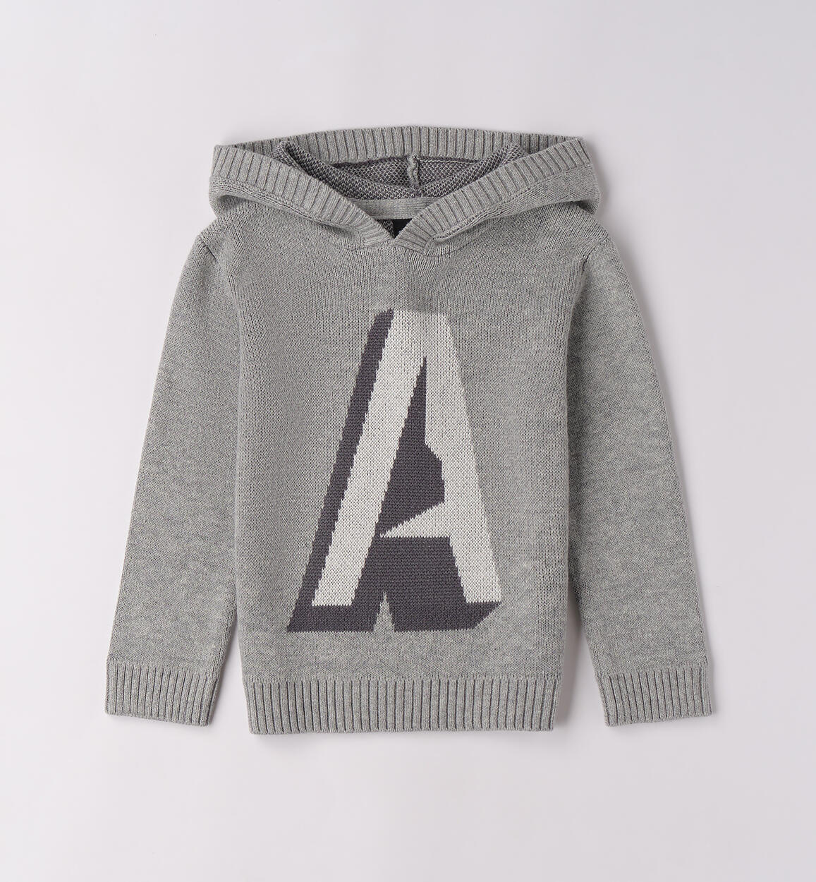 Sarabanda sweater for boys aged 9 months to 8 years made of tricot. Model features hood and front intarsia.