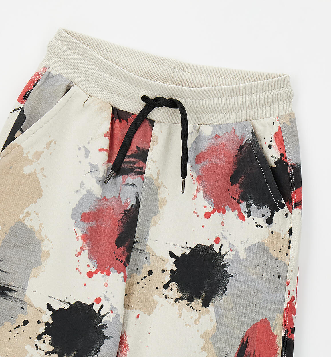 Sarabanda boys' lightweight 100% cotton fleece shorts. Basketball style with an elastic waistband and drawstring. Below-the-knee length and an all-over print.