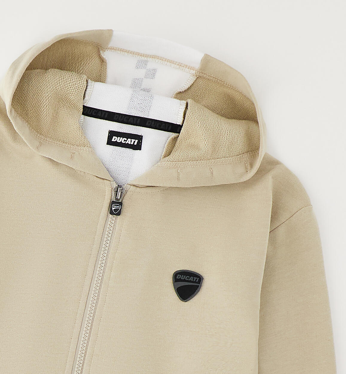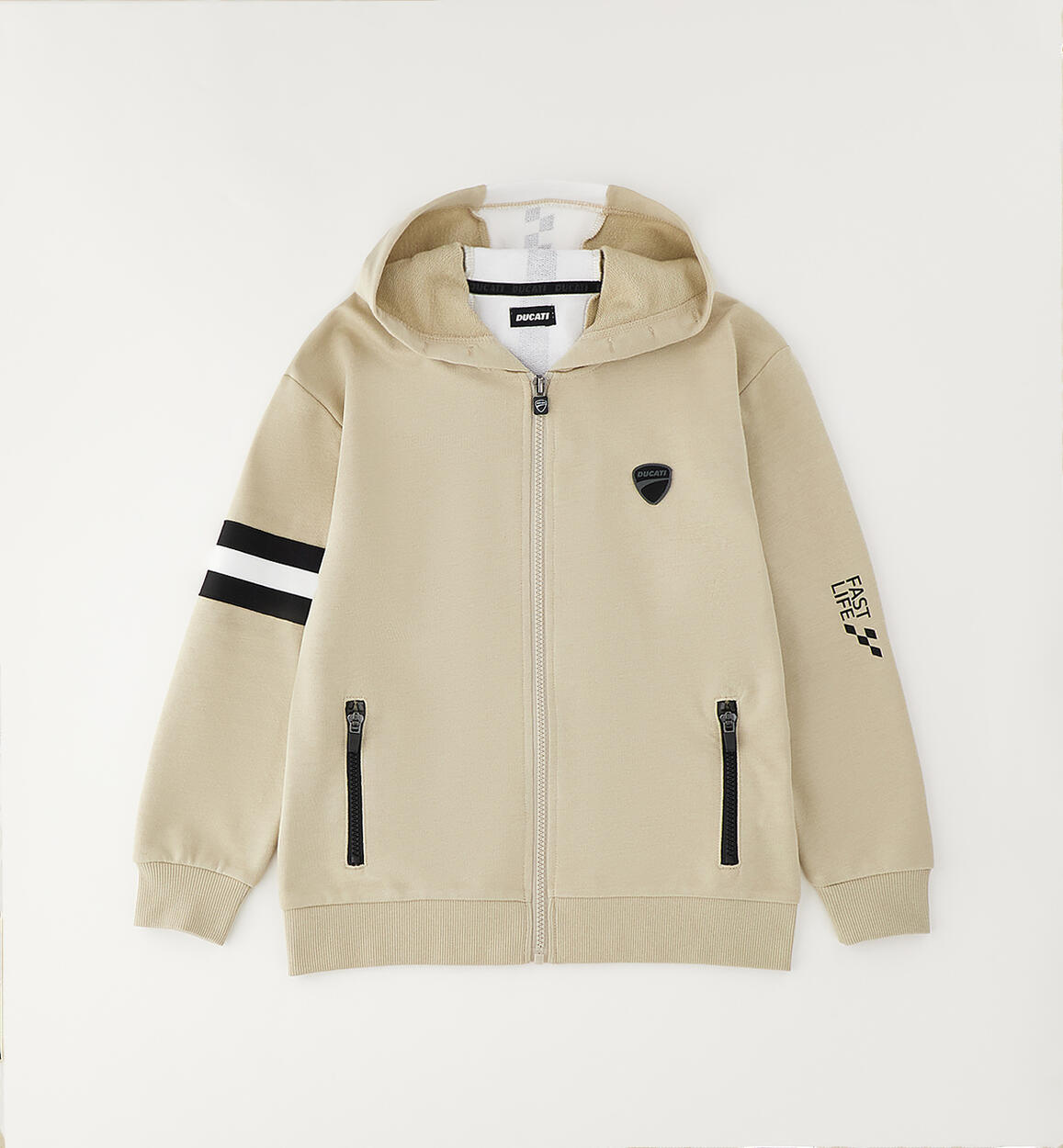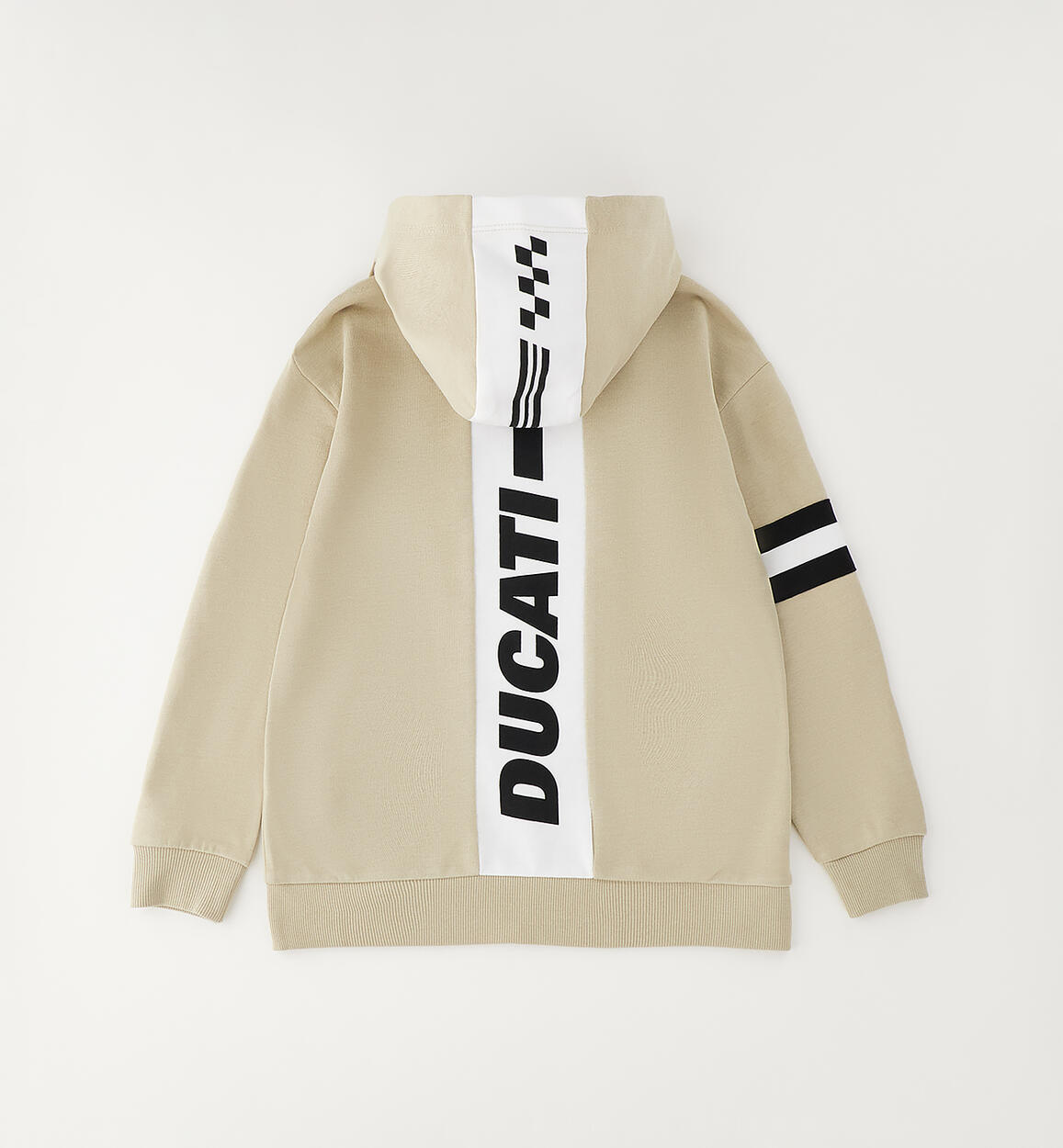 Ducati boys' long-sleeved hooded sweatshirt with zip closure. Appliqué on the sleeve and print on the back. Zip pockets. Dropped shoulders. By choosing our cotton products, you support our investment in the Better Cotton mission. This product is supplied through a mass balance system and may not contain Better Cotton. Learn more at bettercotton.org/massbalance