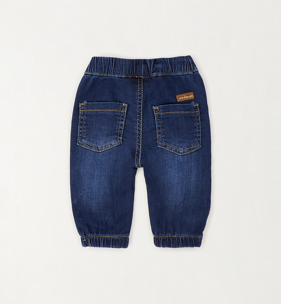 Minibanda baby boy's long denim knit trousers made of stretch cotton. Elastic waist and leg cuffs. By choosing our cotton products, you support Minibanda's commitment to the Better Cotton mission. This product is supplied through a mass balance system and may not contain Better Cotton. Learn more at bettercotton.org/massbalanceComposition