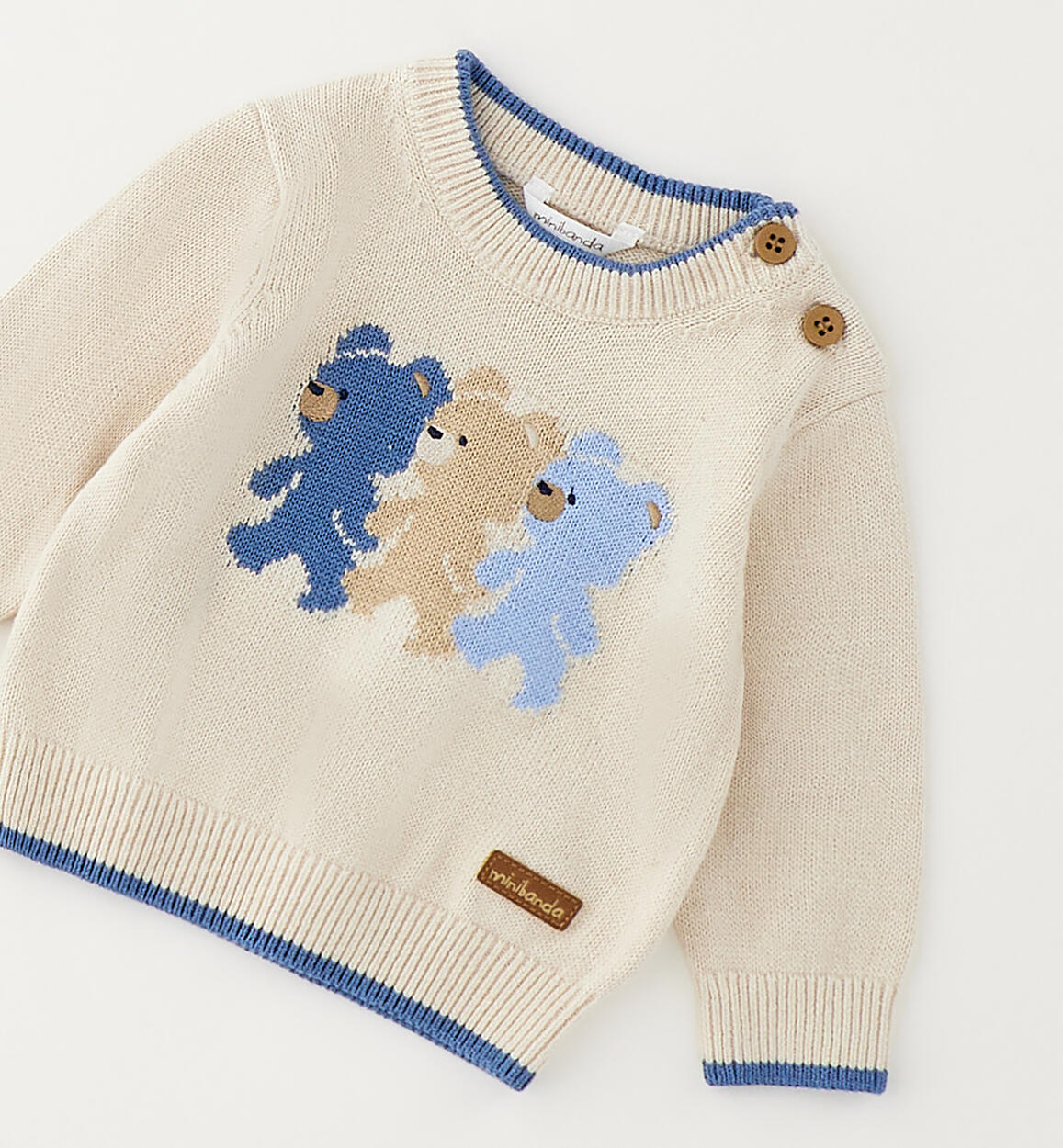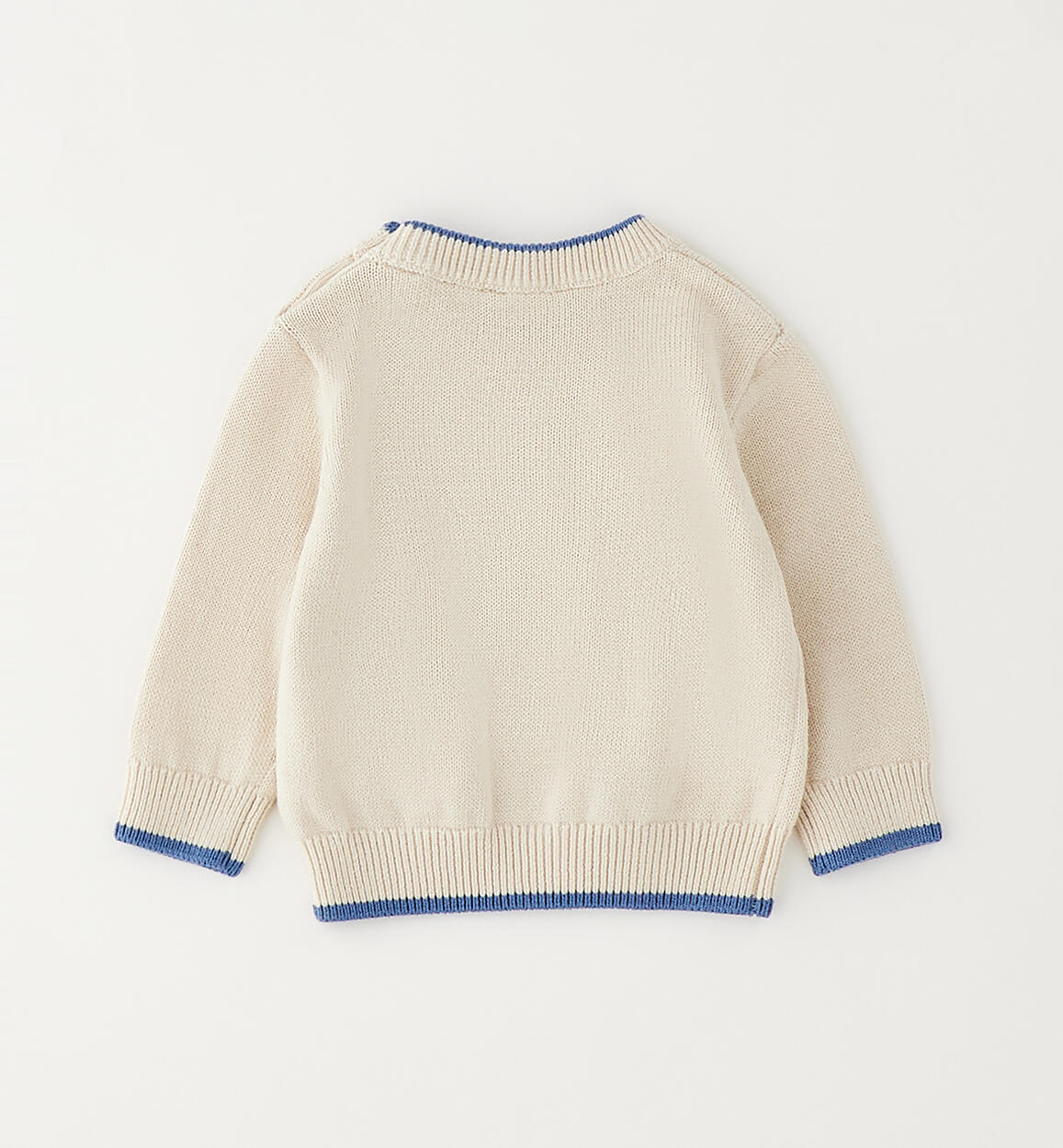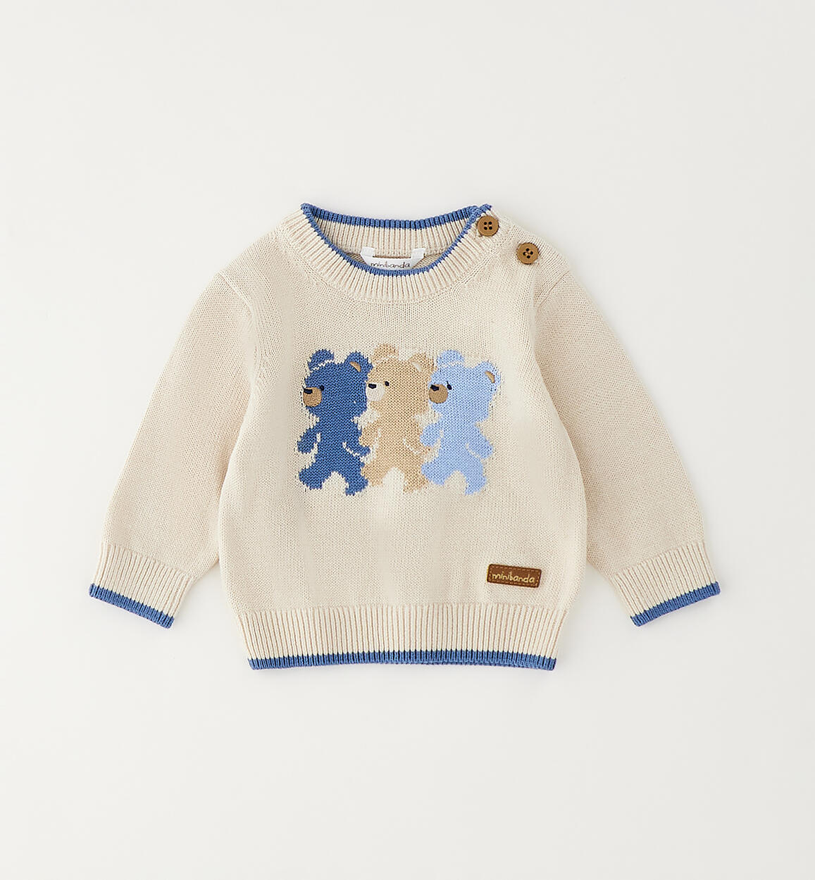 Minibanda baby's closed sweater made of 100% cotton tricot with intarsia embroidery on the front. It opens at the shoulder with buttons. By choosing our cotton products, you support Minibanda's commitment to the Better Cotton mission. This product is supplied through a mass balance system and may not contain Better Cotton. Learn more at bettercotton.org/massbalance
