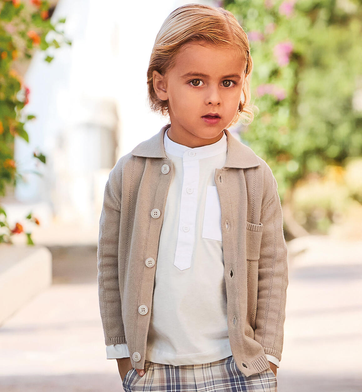 Sarabanda long-sleeved crewneck for boys, made of 100% cotton jersey with poplin details. It features a mandarin collar and an embroidered pocket. Button closure. An external button on the sleeve allows for short sleeves.