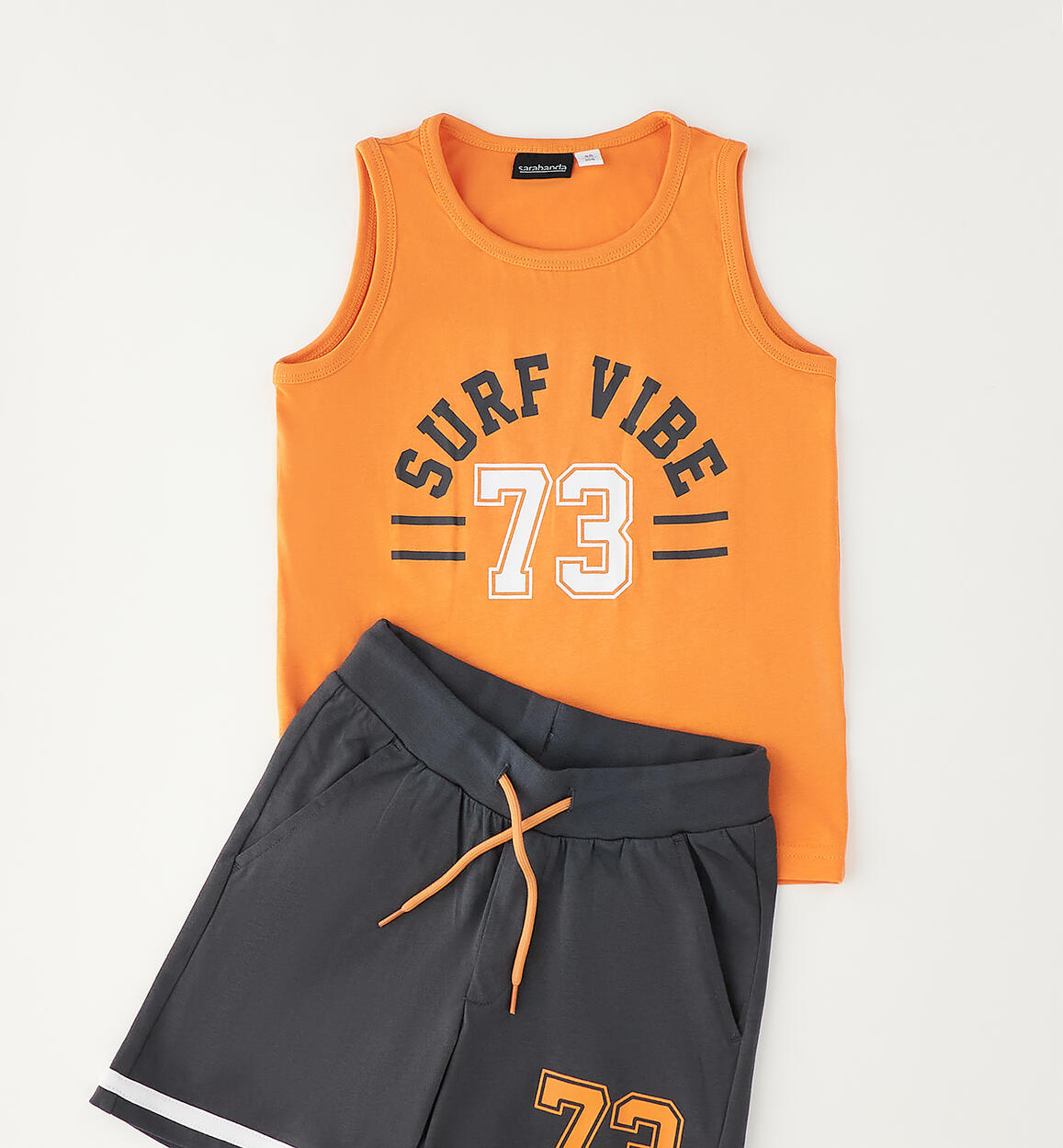 Sarabanda boys' summer outfit made of 100% cotton jersey. The outfit includes a surf print tank top and shorts with an elastic waist and drawstring. Above-the-knee length.