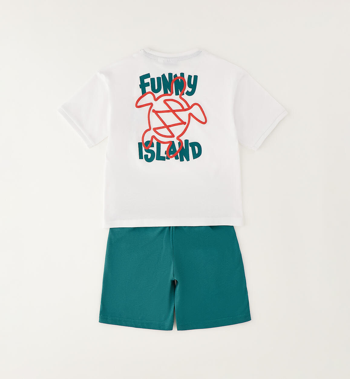 Sarabanda boys' summer outfit made of 100% cotton jersey. This T-shirt features a drop shoulder, turtle print, and shorts with an elastic waistband and drawstring. Knee-length.