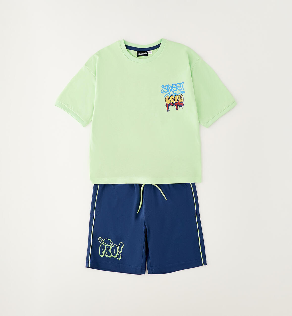 Sarabanda boys' summer outfit made of 100% cotton jersey. This urban-themed T-shirt features dropped shoulders. Shorts with an elastic waistband and drawstring are knee-length.