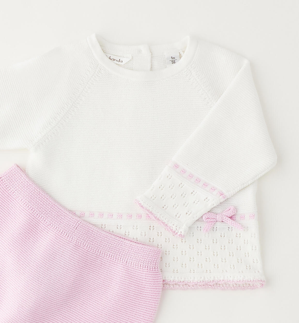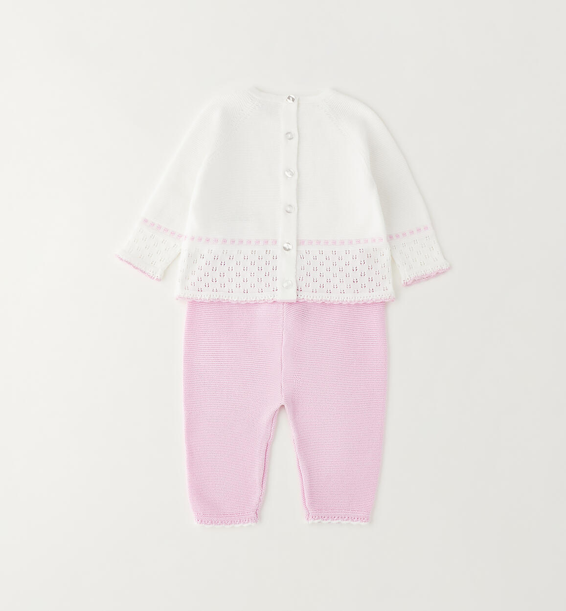 Minibanda baby girl's long-sleeved set made of 100% cotton tricot. The shirt opens at the back with buttons. By choosing our cotton products, you support Minibanda's commitment to the Better Cotton mission. This product is supplied through a mass balance system and may not contain Better Cotton. Learn more at bettercotton.org/massbalance