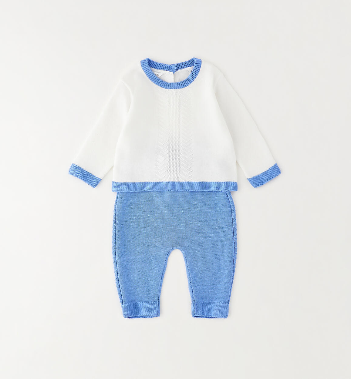 Minibanda baby boy's long-sleeved set made of 100% cotton tricot. The shirt features a unique knit, contrasting color details to match the pants, and a button-up back. By choosing our cotton products, you support Minibanda's commitment to the Better Cotton mission. This product is supplied through a mass balance system and may not contain Better Cotton. Learn more at bettercotton.org/massbalance