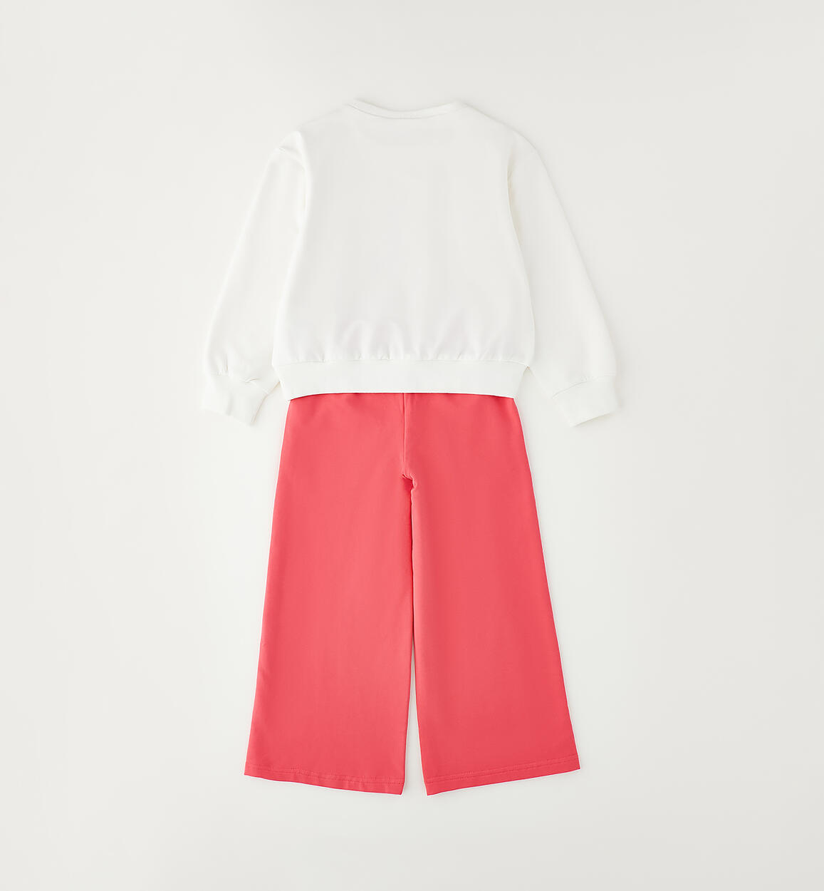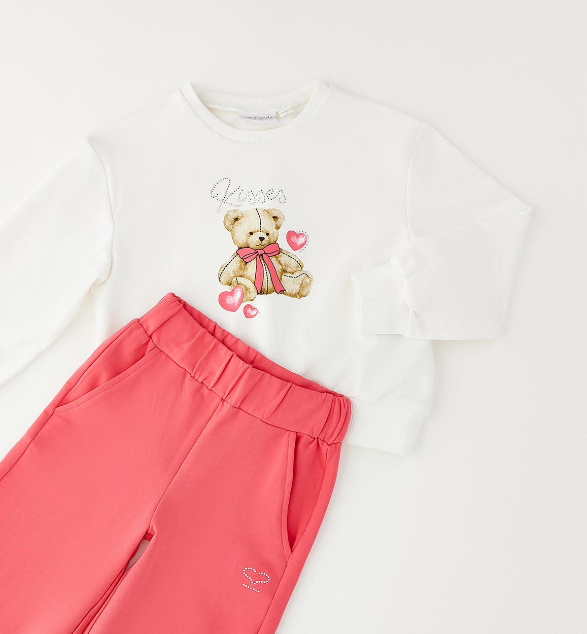 Sarabanda two-piece tracksuit for girls made of stretch cotton fleece. Crewneck sweatshirt with rhinestone print. Pants with elastic waist and drawstring. Loose fit with rhinestone logo.