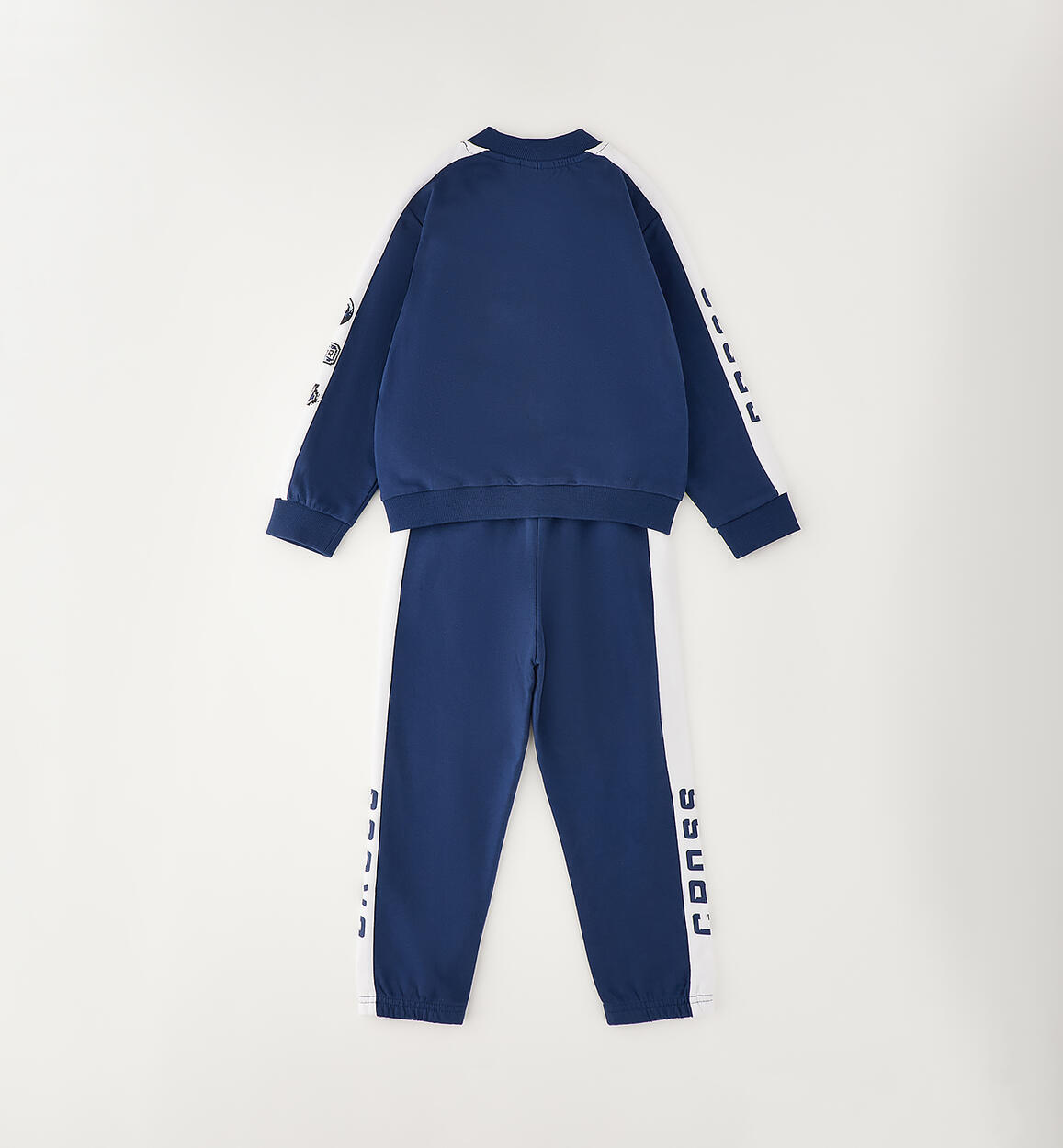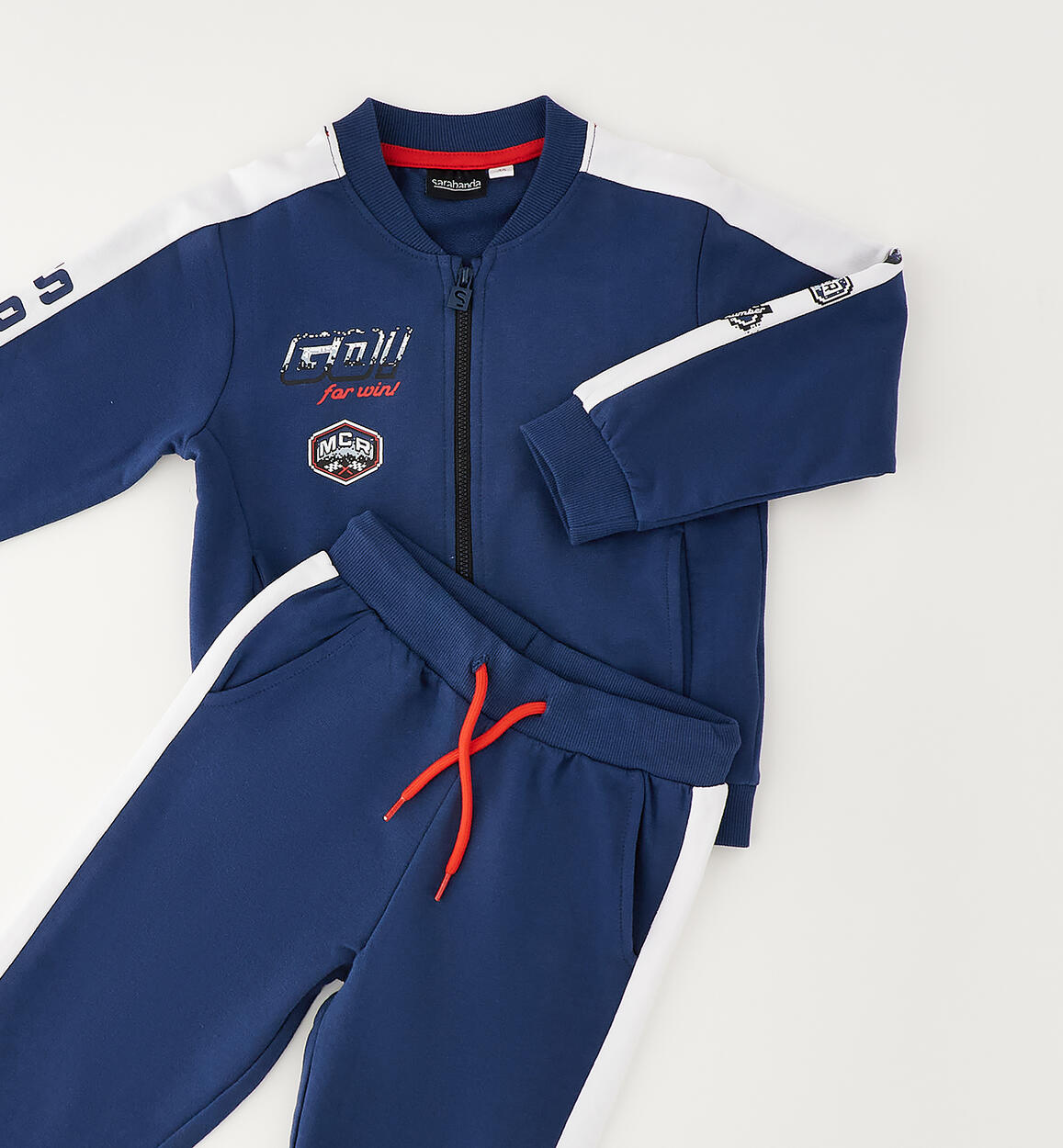Sarabanda two-piece tracksuit for boys made of 100% cotton fleece. The jacket features a zip fastening, side pockets, and a motocross print. The trousers feature pockets, side stripes, and an elastic waistband with drawstring.