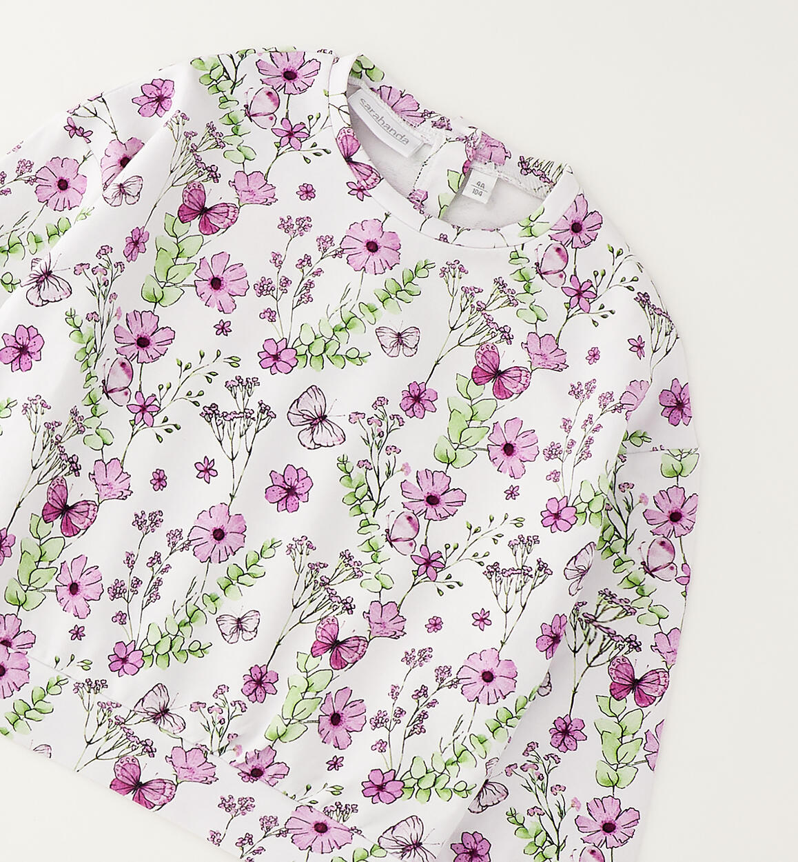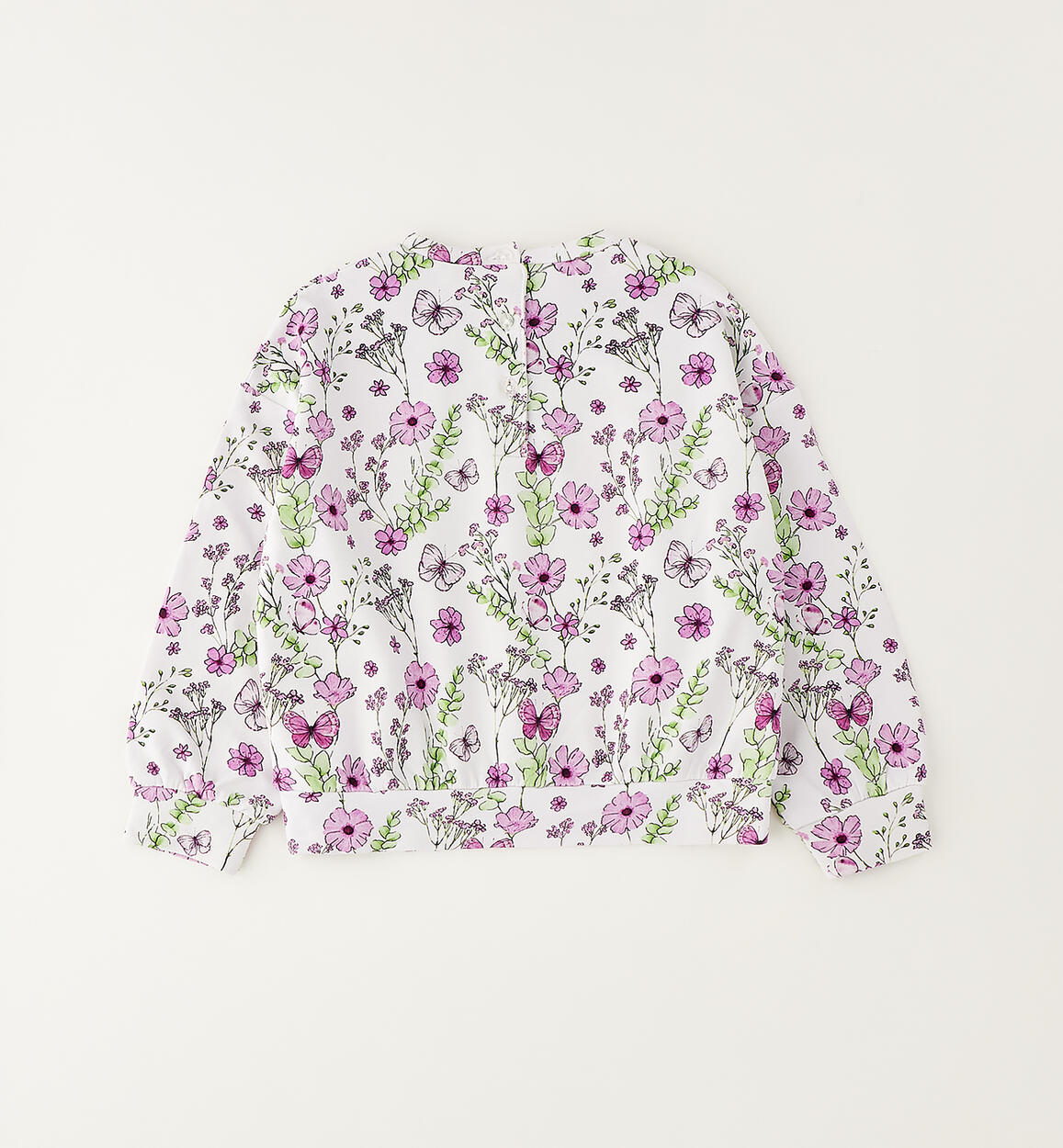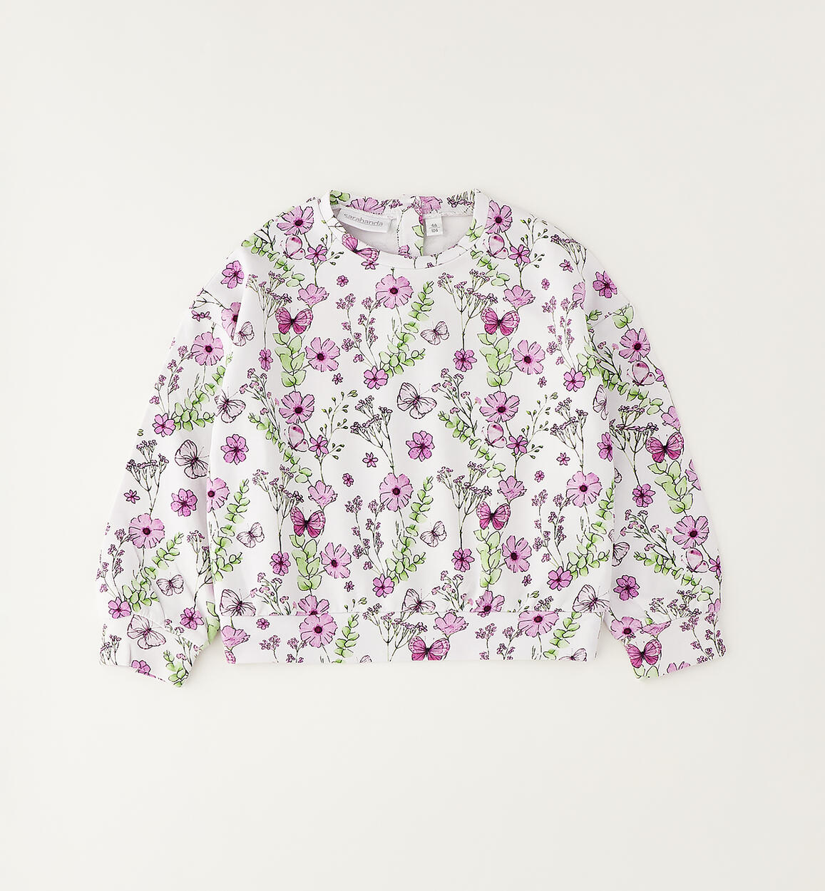 Sarabanda girls' crewneck sweatshirt made of stretch cotton French terry with a floral pattern. It opens at the back with buttons.