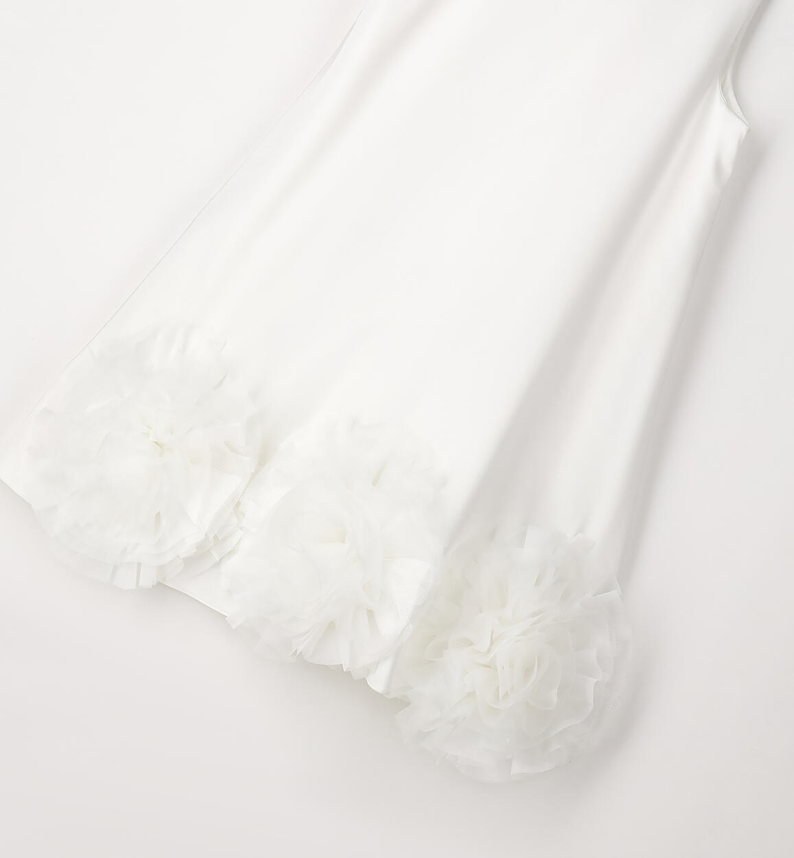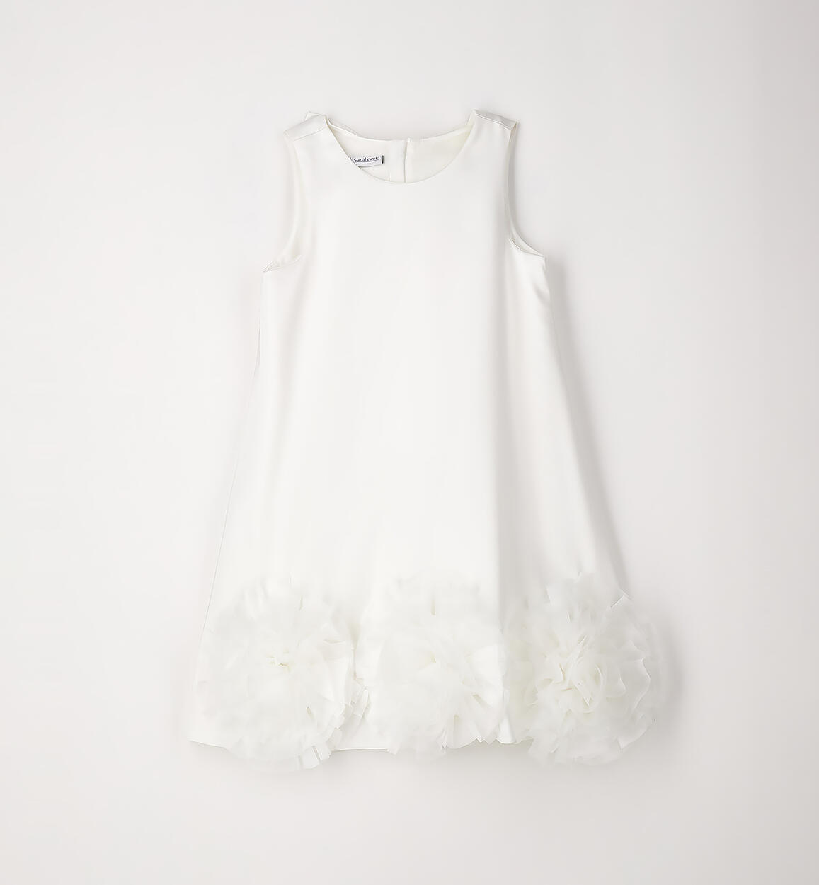 Sarabanda elegant girl's dress made of satin with an organza appliqué at the hem. Tulle insert under the skirt. Cotton lining. Back opening with invisible zip and bow at the back. Above-the-knee length. This model is part of the Sarabanda Premium collection, designed for more formal ceremonies.Composition