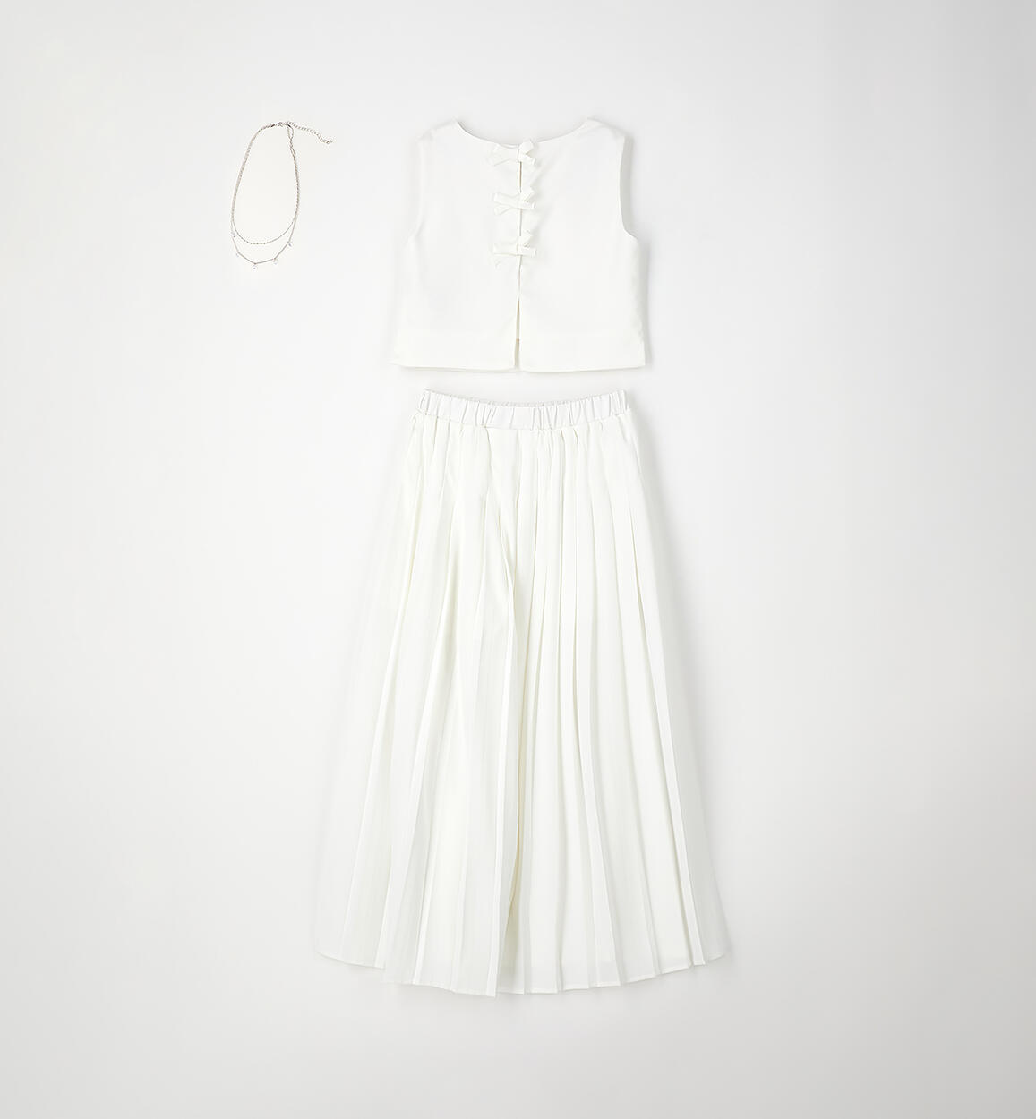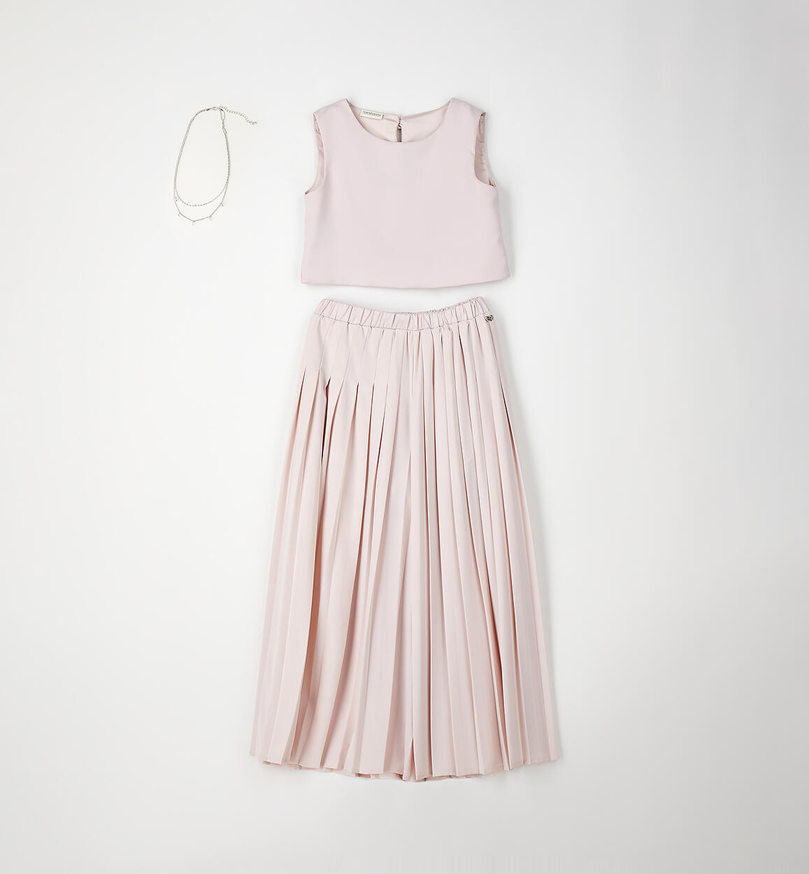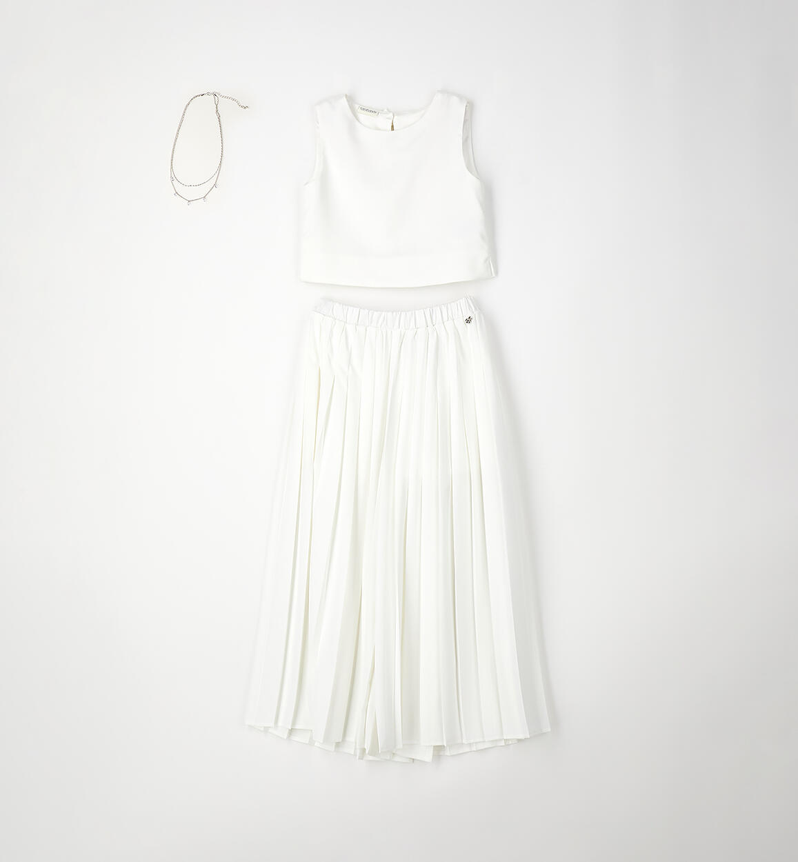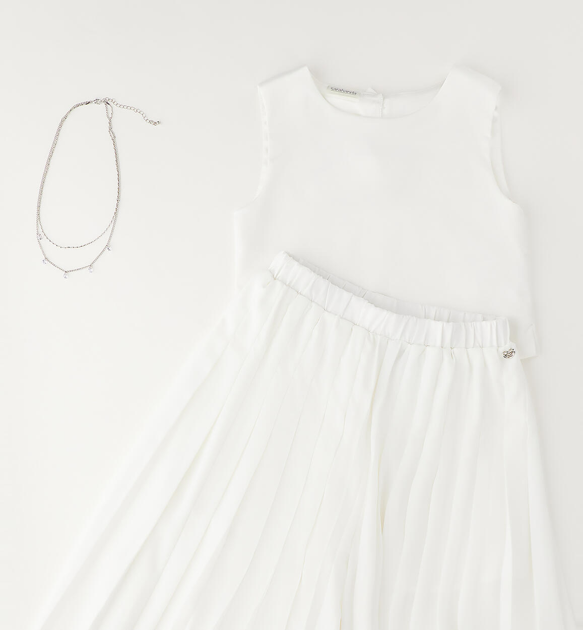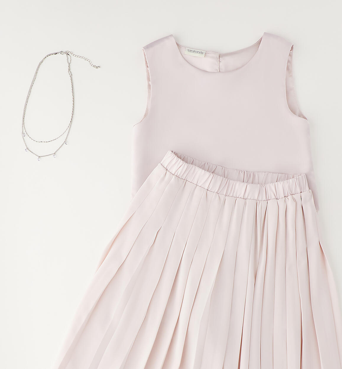 Elegant Sarabanda girl's outfit. Satin top with button fastening at the back. Pleated ottoman trousers with satin lining above the knee. The outfit is part of the Sarabanda Premium collection, designed for more formal occasions. Matching pendant necklace.Composition