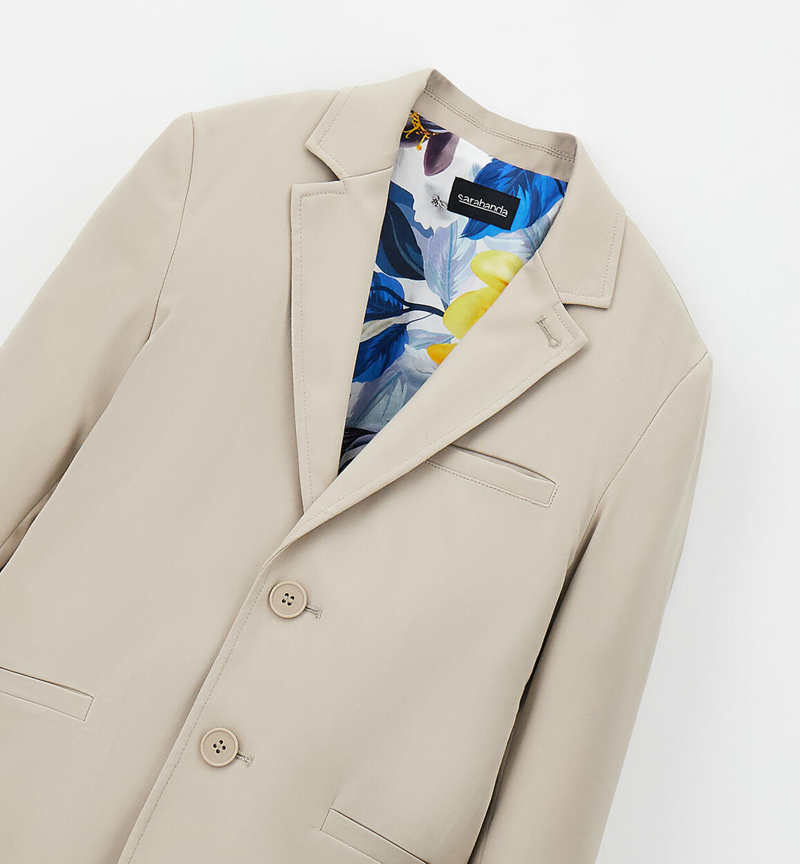 Sarabanda boys' jacket made of stretch twill with a button opening. The pocket has a patterned lining that can be used as a handy pocket square. This model is part of the Sarabanda Premium collection, designed for more formal occasions.Composition