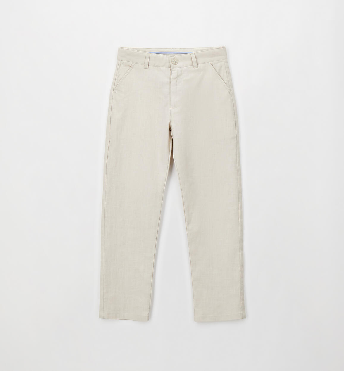 Sarabanda boys' long trousers made of linen and cotton. Zip and button closure. Regular fit. Adjustable waist with internal elastic buttonhole. This style is part of the Sarabanda Premium collection, designed for more formal occasions.Composition