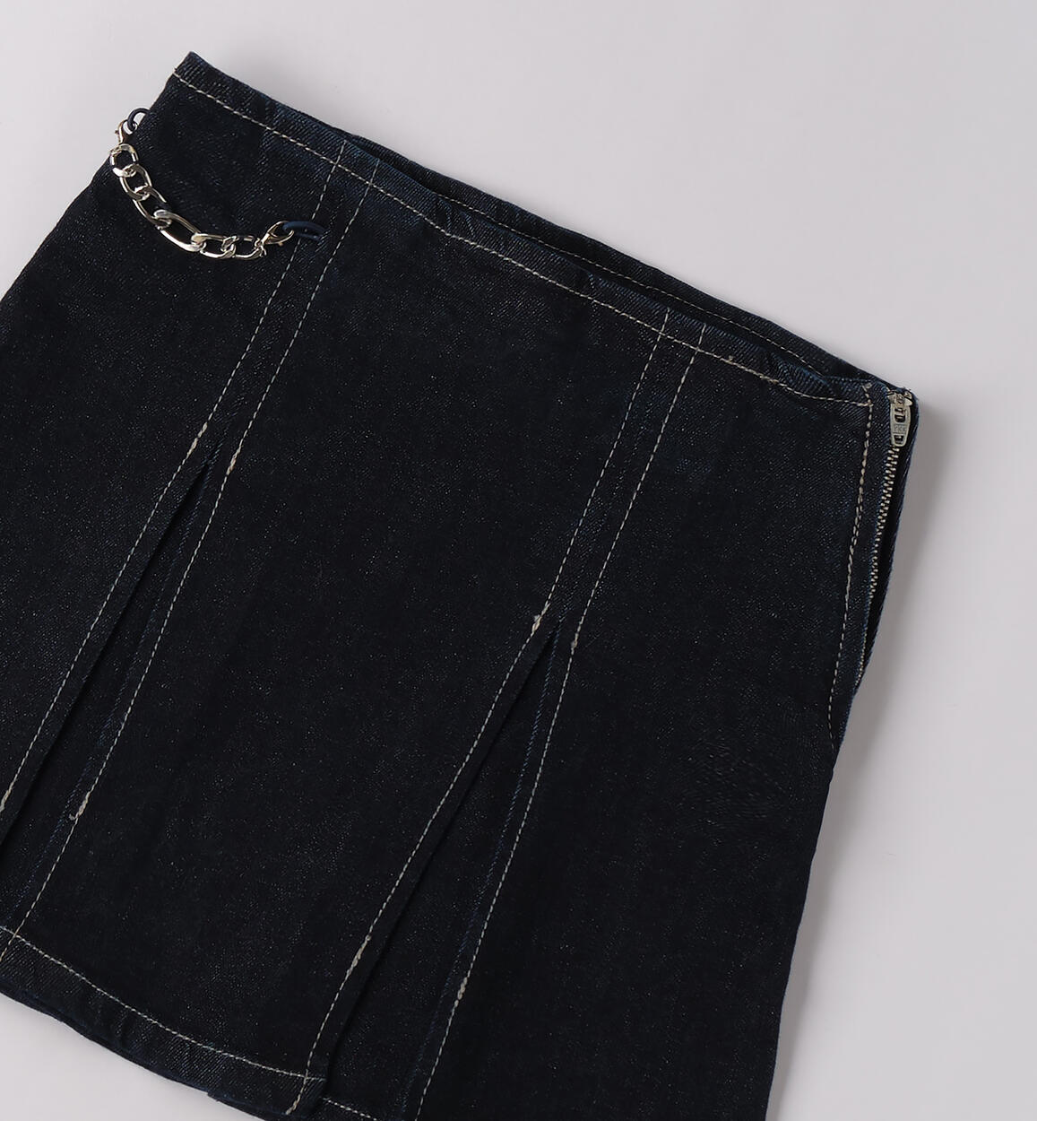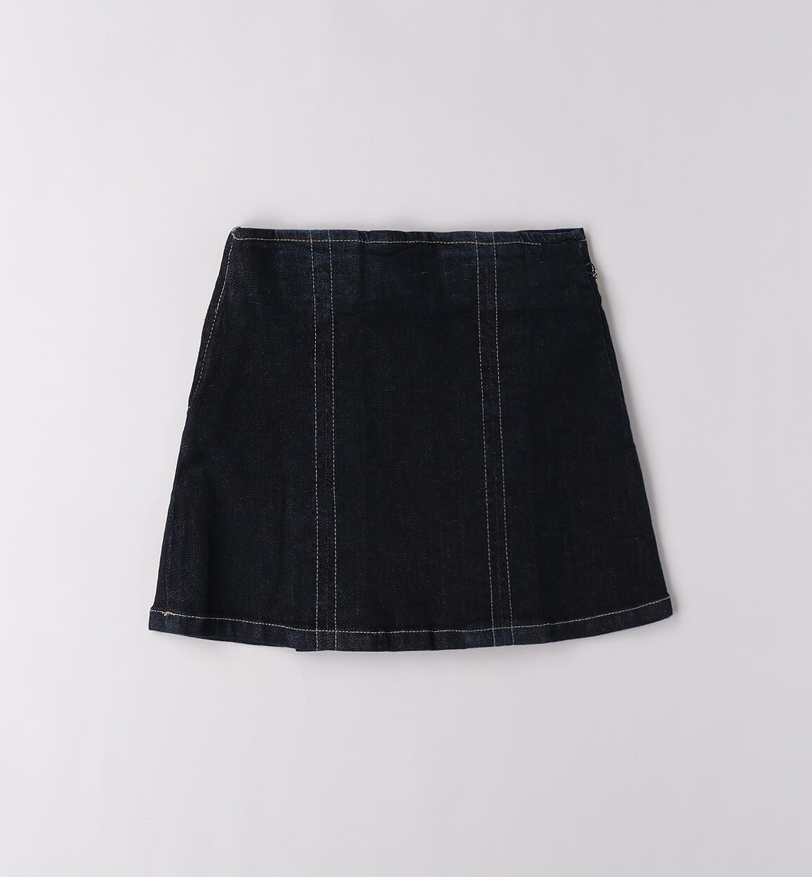 Sarabanda skirt for girls aged 8 to 16 years made of stretch cotton denim. Pleated model with chain appliqué. Zip closure. Adjustable waist with internal elastic. Mini length.