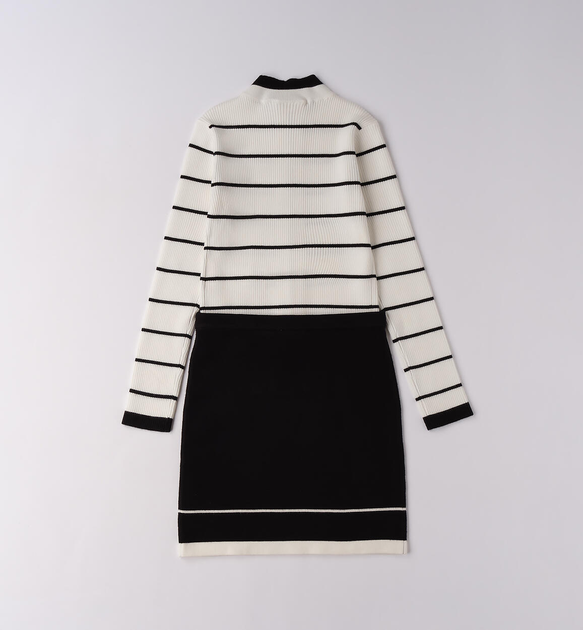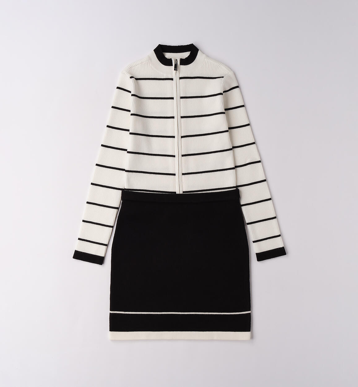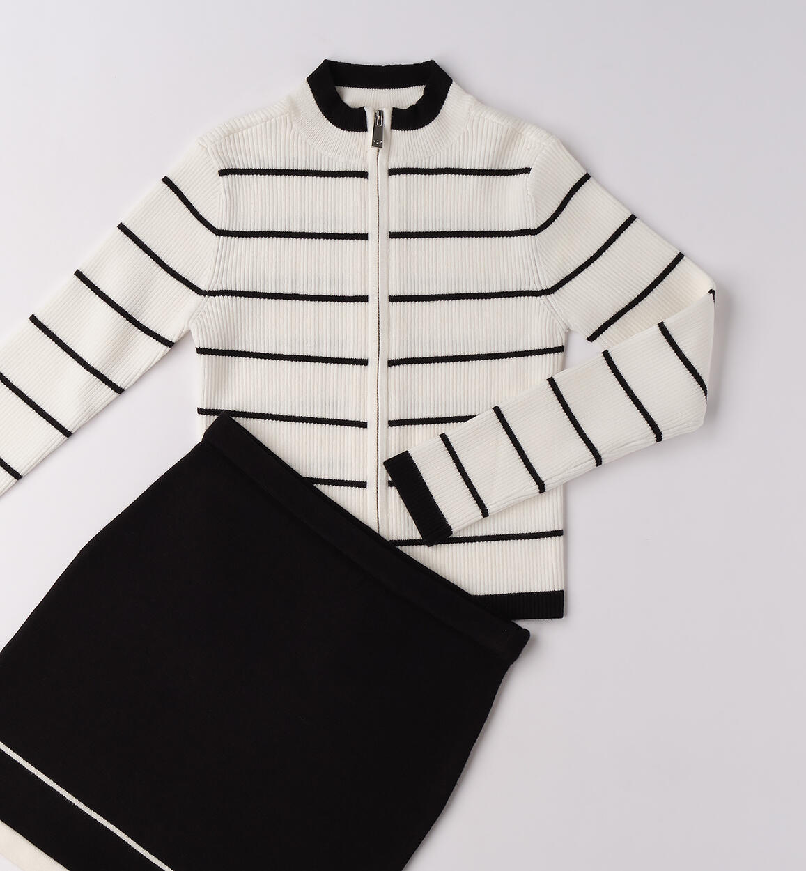 Sarabanda outfit for girls aged 8 to 16 years made of tricot. Includes jacket and skirt. The jacket features zip opening and striped pattern. Skirt is above-the-knee length.Composition