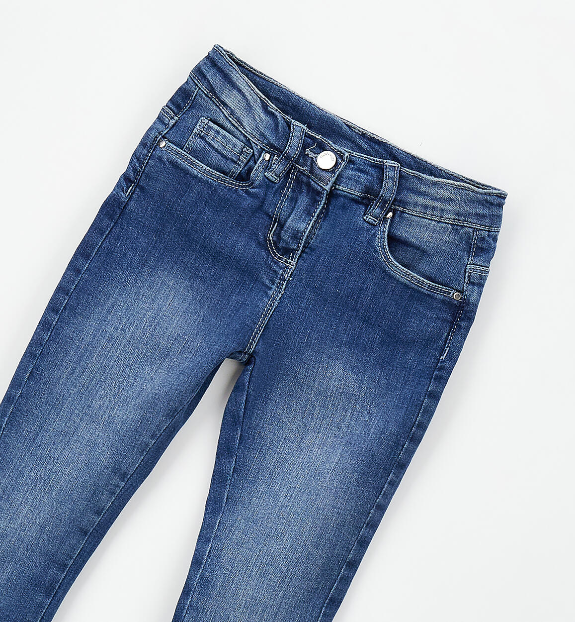 Sarabanda girls' long cotton stretch denim trousers. Zip and button closure. Adjustable waist with internal elastic loop.