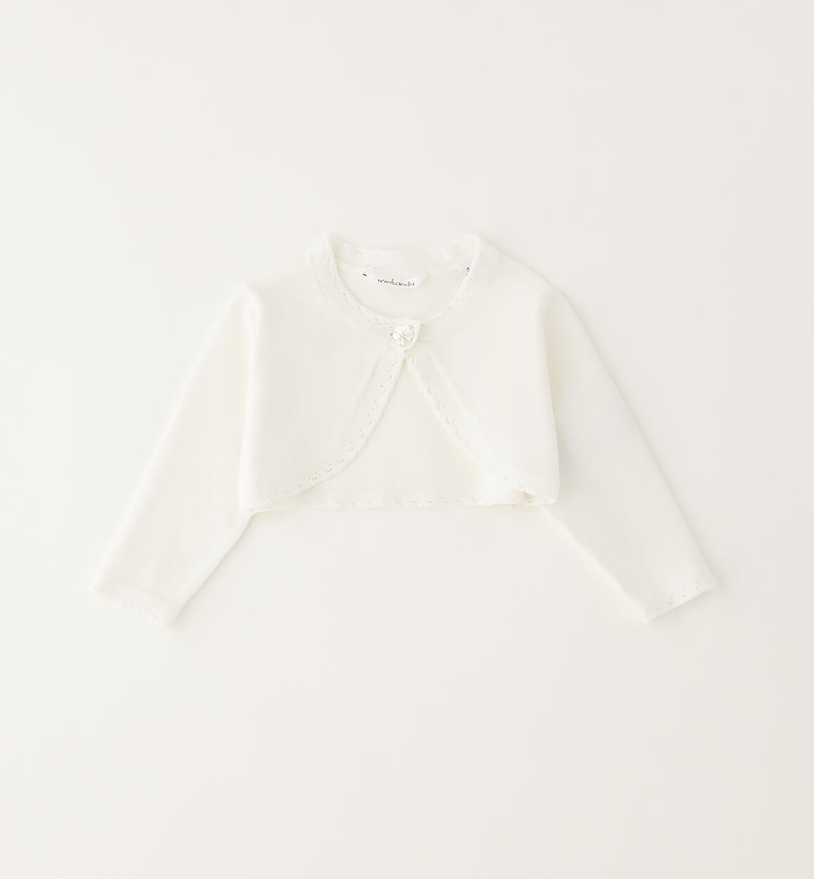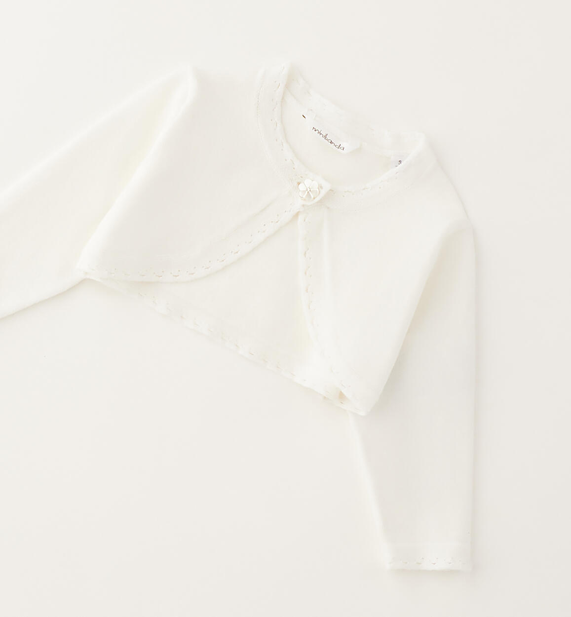 Minibanda baby girl shrug made of tricot with perforated finishes and button closure enriched with rhinestonesComposition