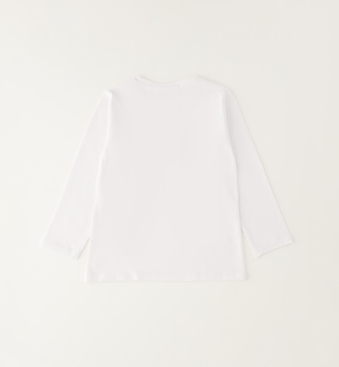 Sarabanda long-sleeved crewneck sweater for girls made of stretch cotton jersey with a print and appliques. Rhinestone logo at the hem. Back button closure for sizes up to 3 years.