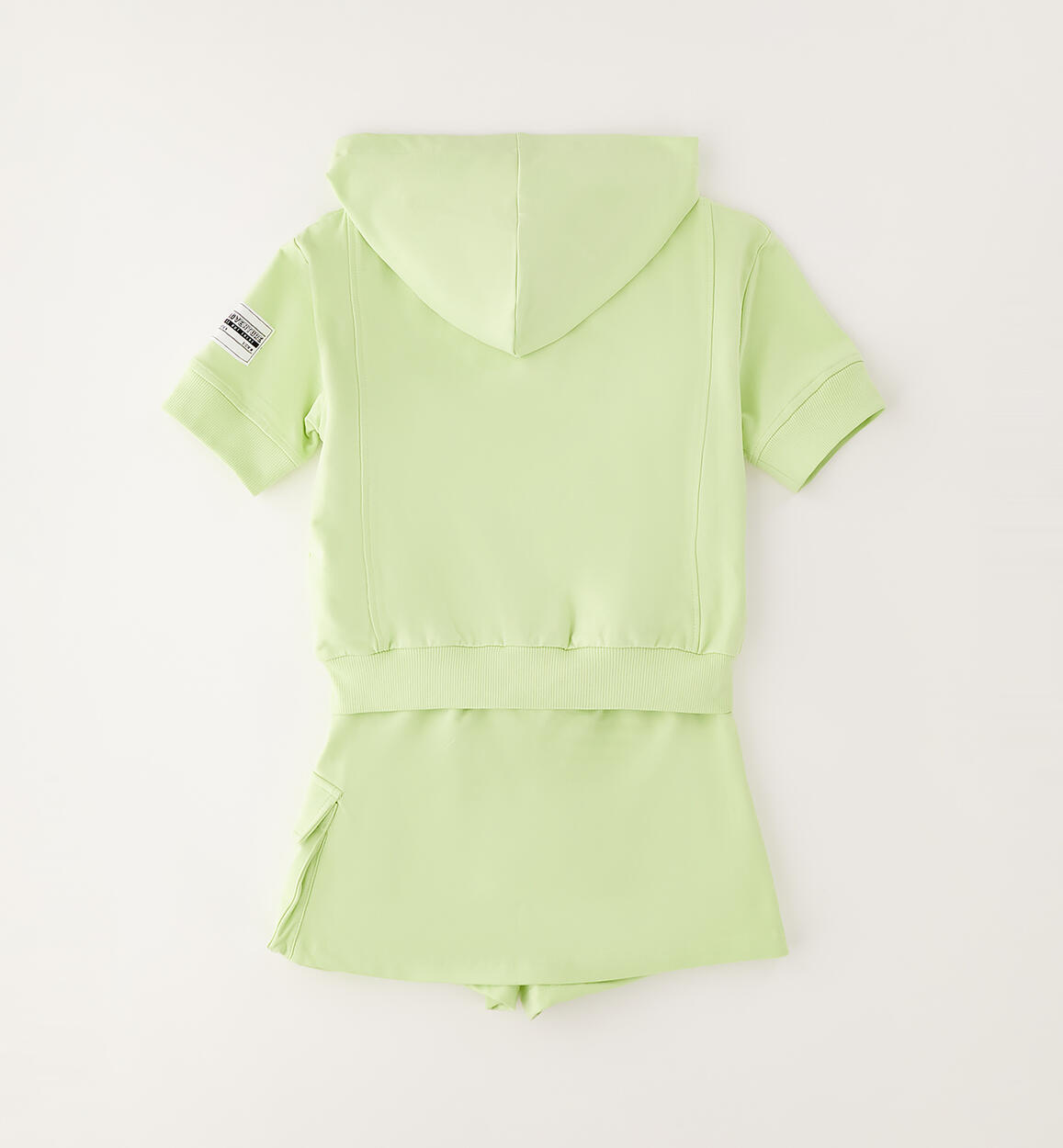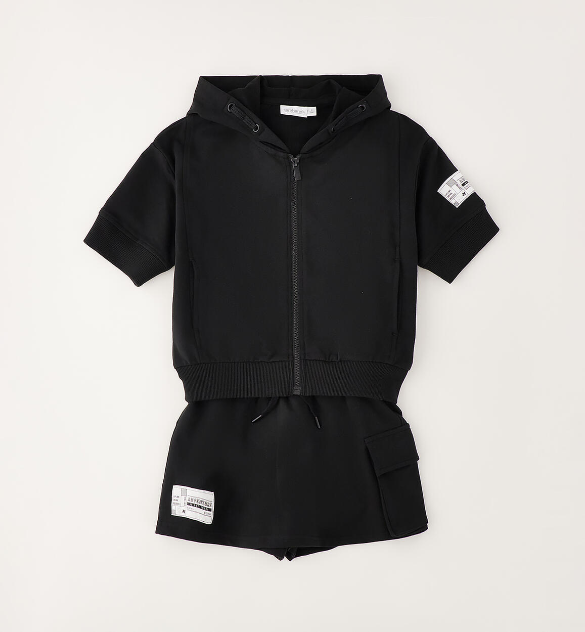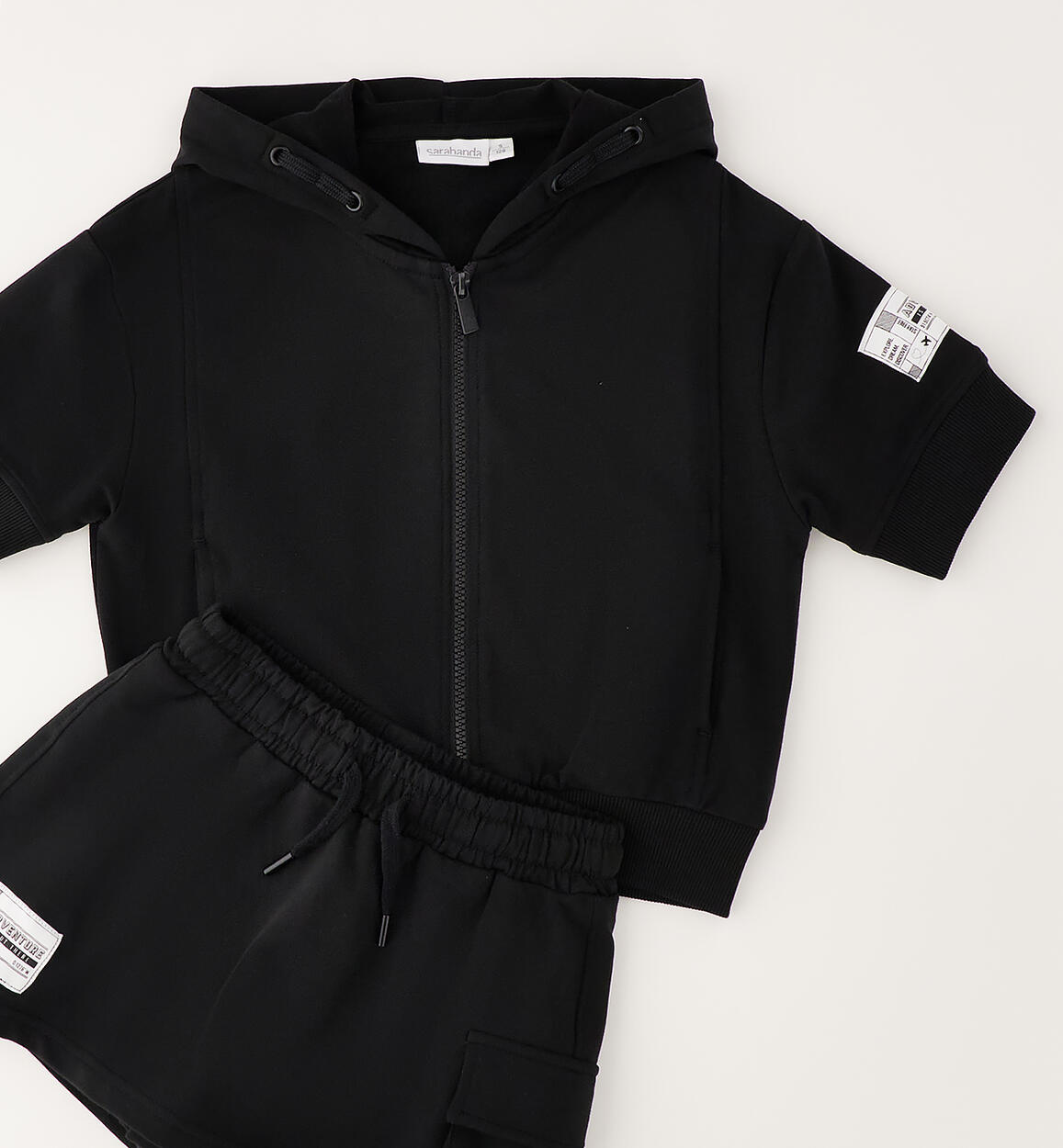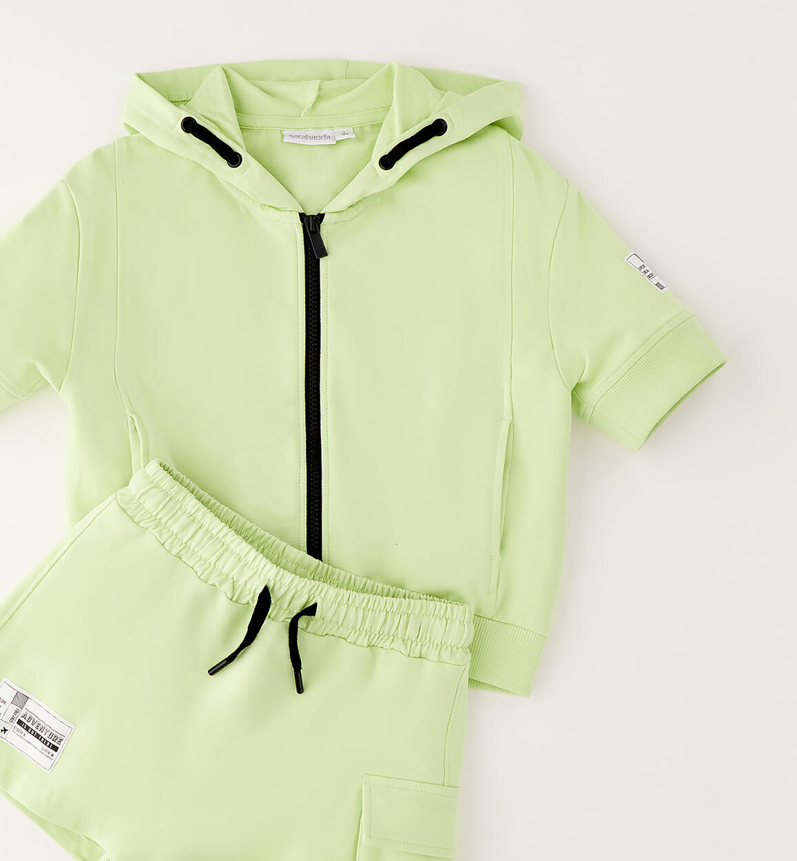 Sarabanda girls' short-sleeved set made of stretch cotton fleece. Short-sleeved hooded sweatshirt with zip closure and pockets. Skirt-style shorts with elastic waistband and drawstring. Side pocket.Composition
