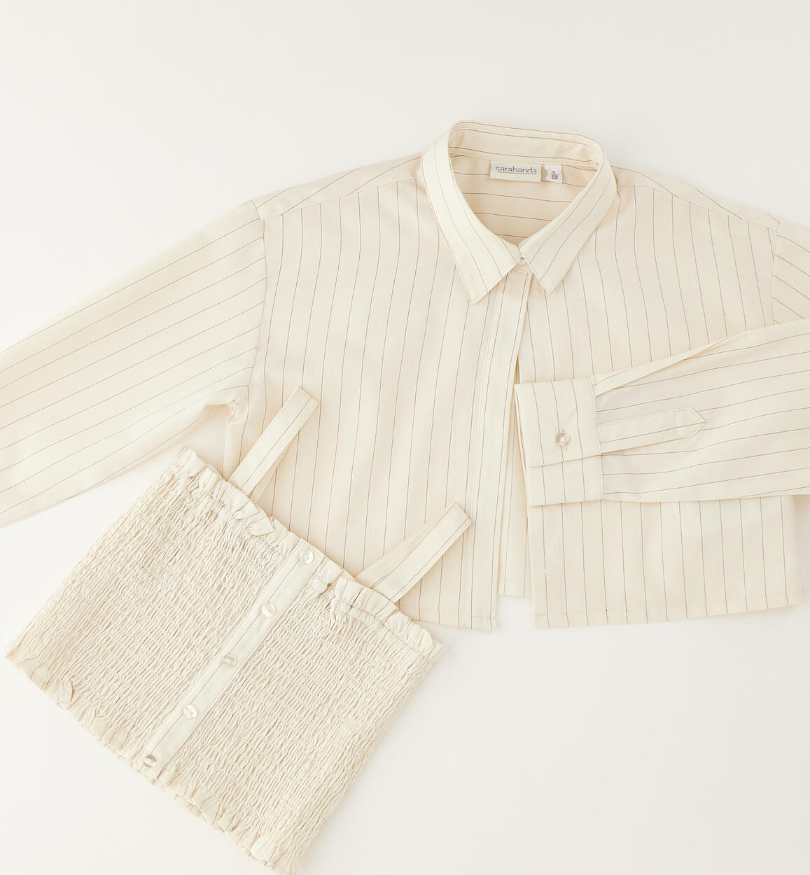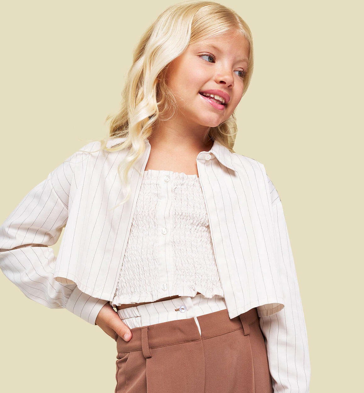 Sarabanda long-sleeved shirt for girls made of striped fabric embroidered with lurex thread. Button closure. Cropped design with matching elasticated top.Composition