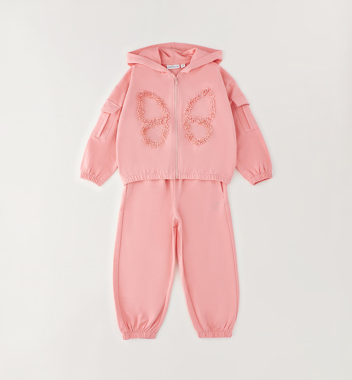 Sarabanda two-piece tracksuit for girls made of stretch cotton fleece. The hooded jacket features a zip fastening. Pockets on the sleeves and a rhinestone logo. The front is embellished with rhinestones and appliques. The trousers feature pockets, an elastic waistband with drawstring, and a rhinestone logo.