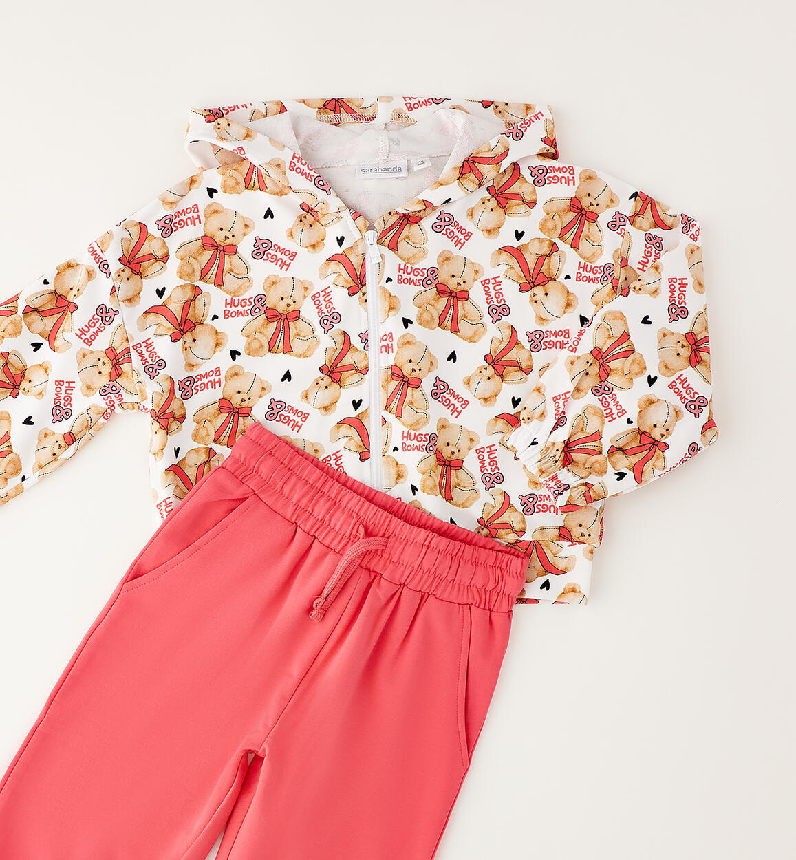 Sarabanda two-piece tracksuit for girls made of stretch cotton fleece. The hooded jacket features a zip closure and an all-over print. Long trousers have an elastic waistband and drawstring.