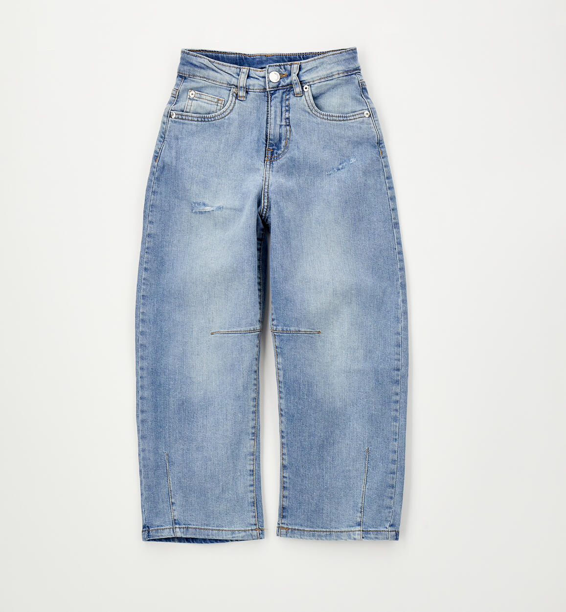 Sarabanda girls' long denim trousers made of stretch cotton denim. Wide-leg style with scuffs. Zip and button closure. Adjustable waist with internal elastic loop.