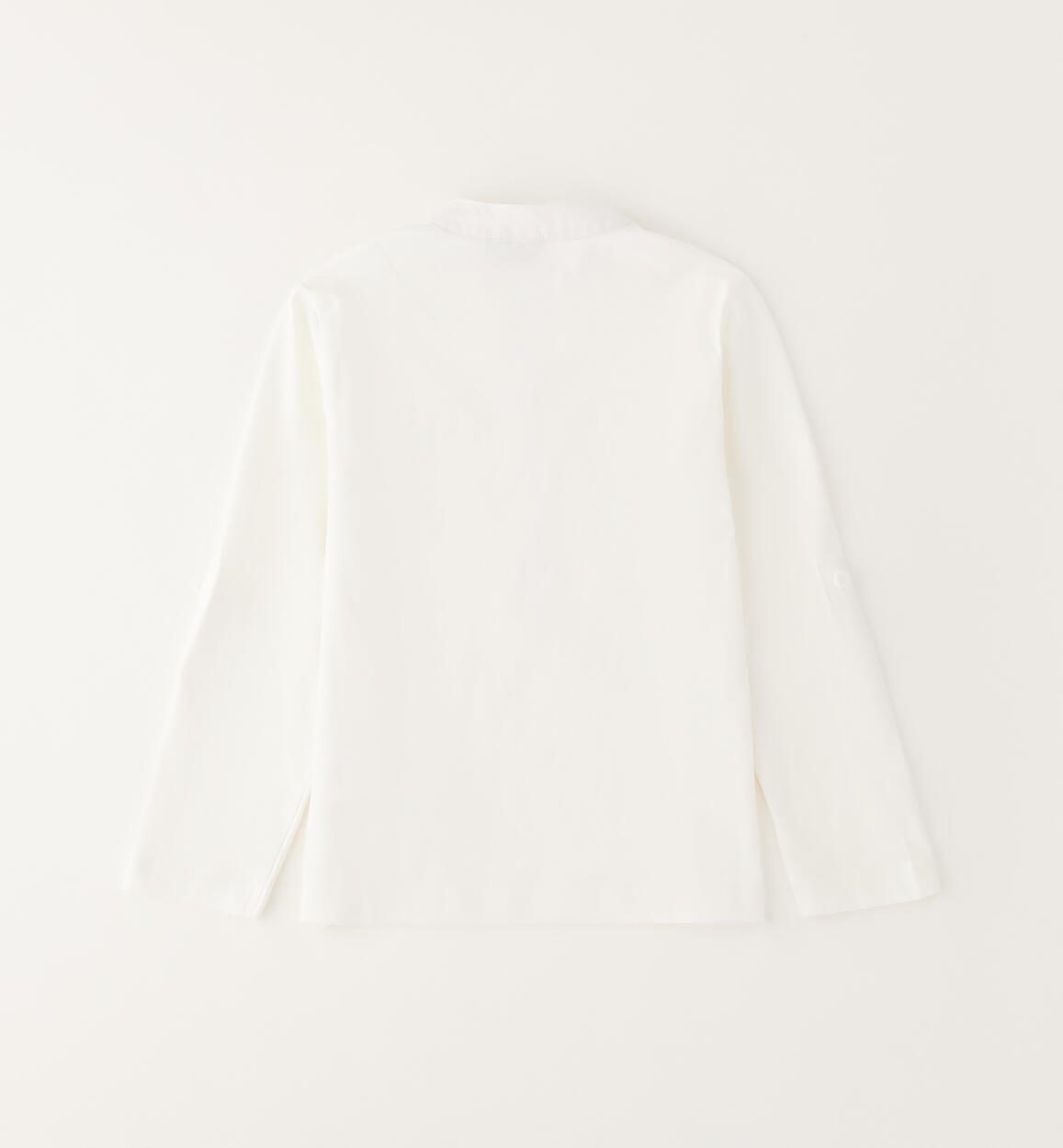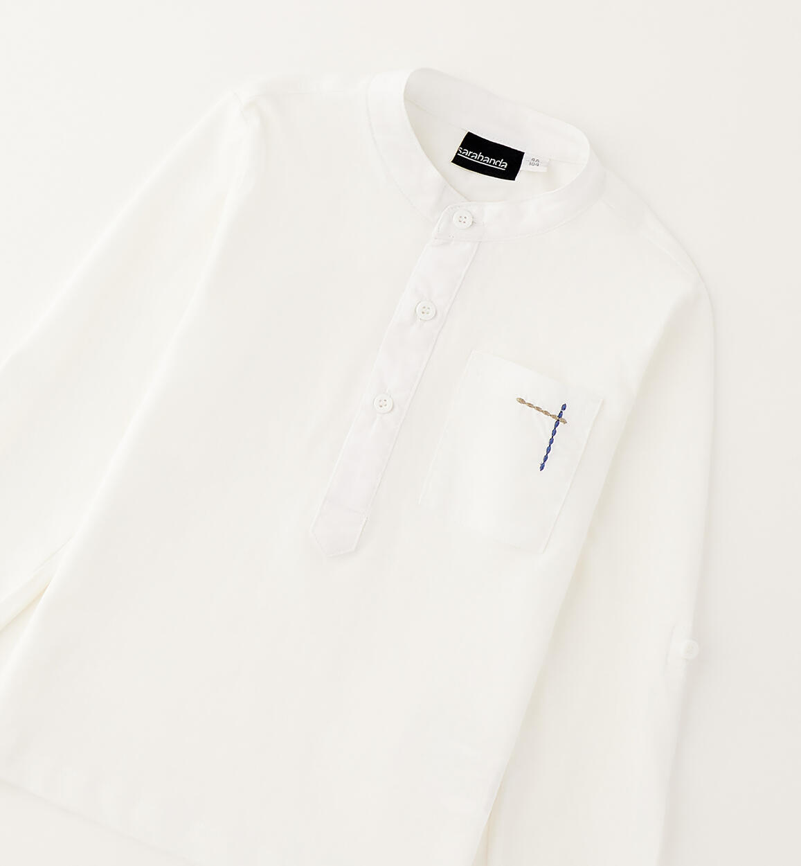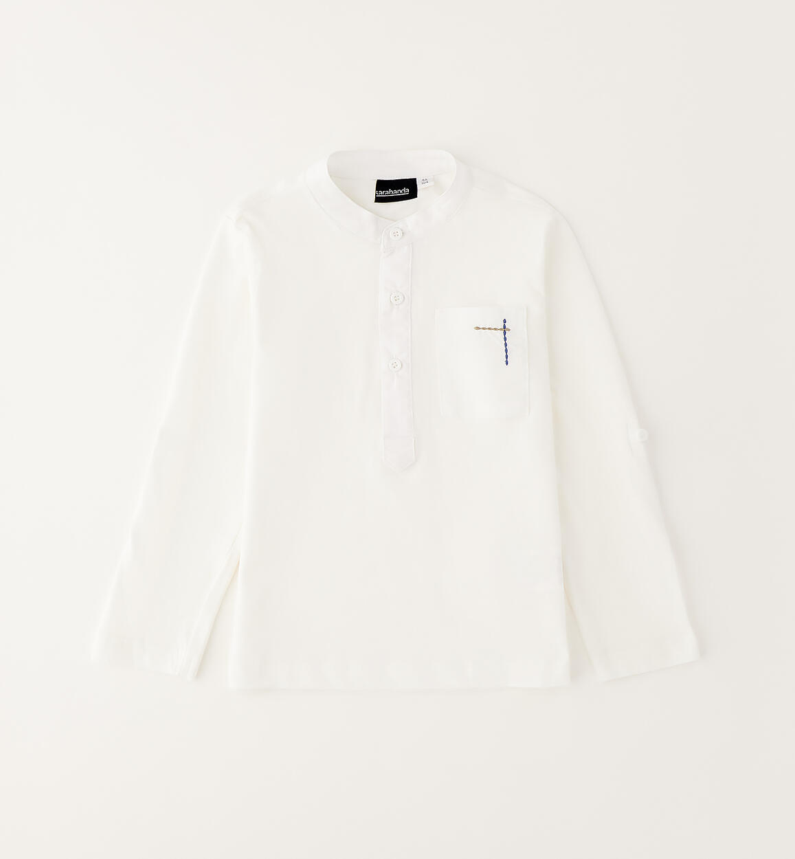 Sarabanda long-sleeved crewneck for boys, made of 100% cotton jersey with poplin details. It features a mandarin collar and an embroidered pocket. Button closure. An external button on the sleeve allows for short sleeves.