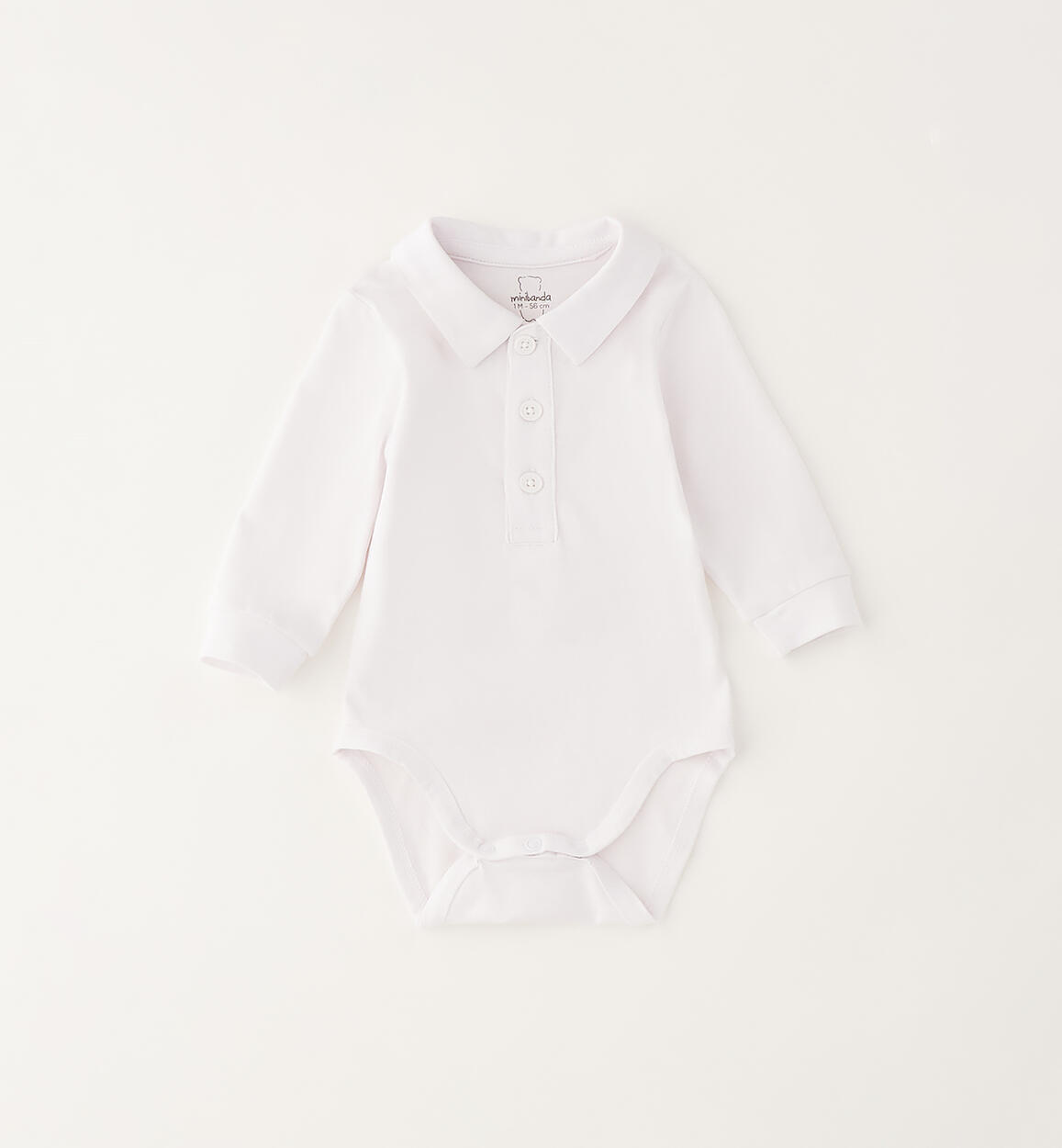 Minibanda long-sleeved baby bodysuit made of stretch cotton jersey. Polo neck opening. Snap buttons on the inside of the leg. By choosing our cotton products, you support Minibanda's commitment to the Better Cotton mission. This product is supplied through a mass balance system and may not contain Better Cotton. Learn more at bettercotton.org/massbalance