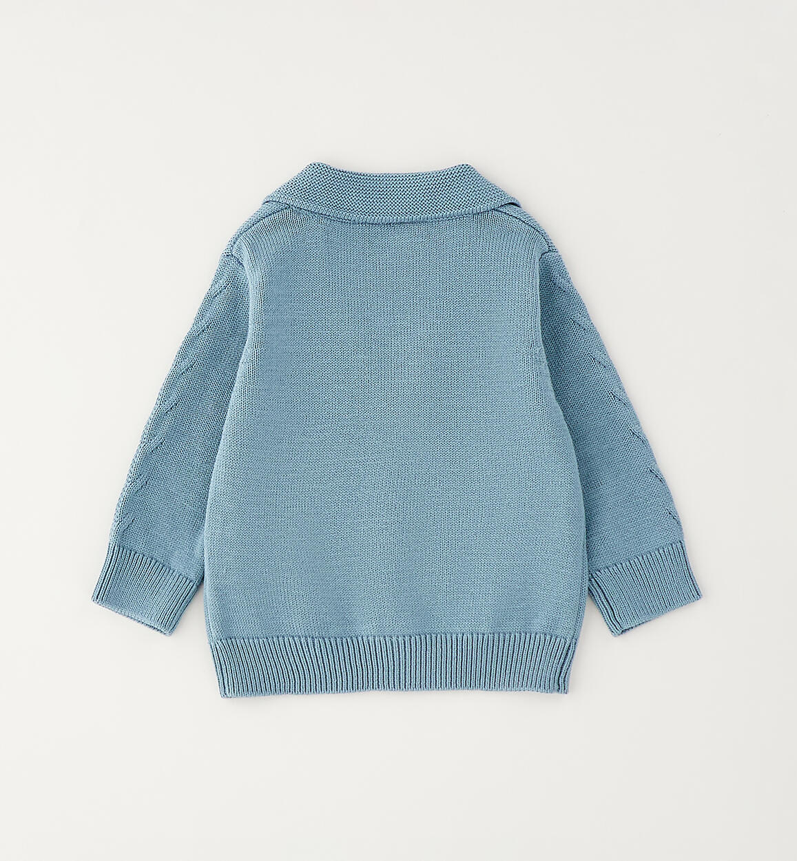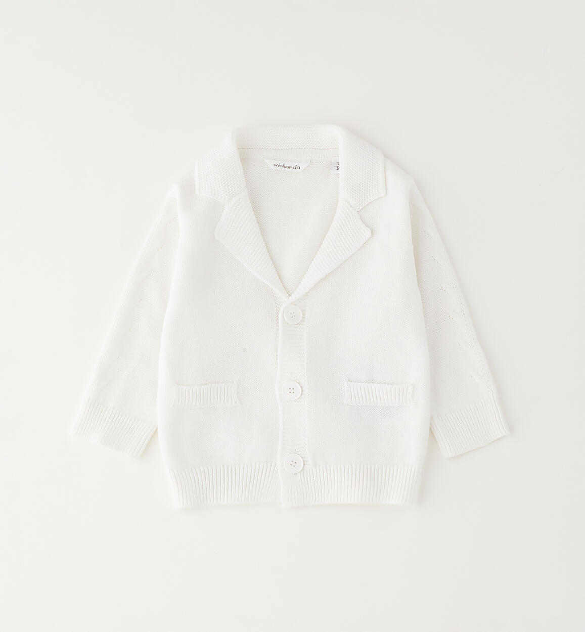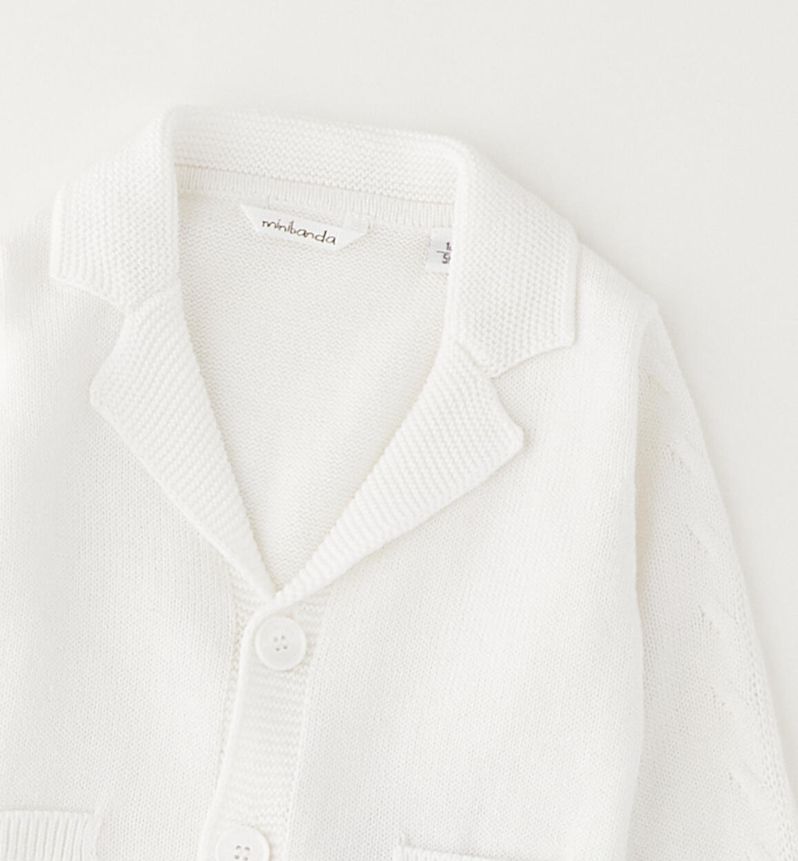 Minibanda baby cardigan made of 100% cotton tricot with a lapel collar, fake pockets, and button closure. By choosing our cotton products, you support Minibanda's commitment to the Better Cotton mission. This product is supplied through a mass balance system and may not contain Better Cotton. Learn more at bettercotton.org/massbalance