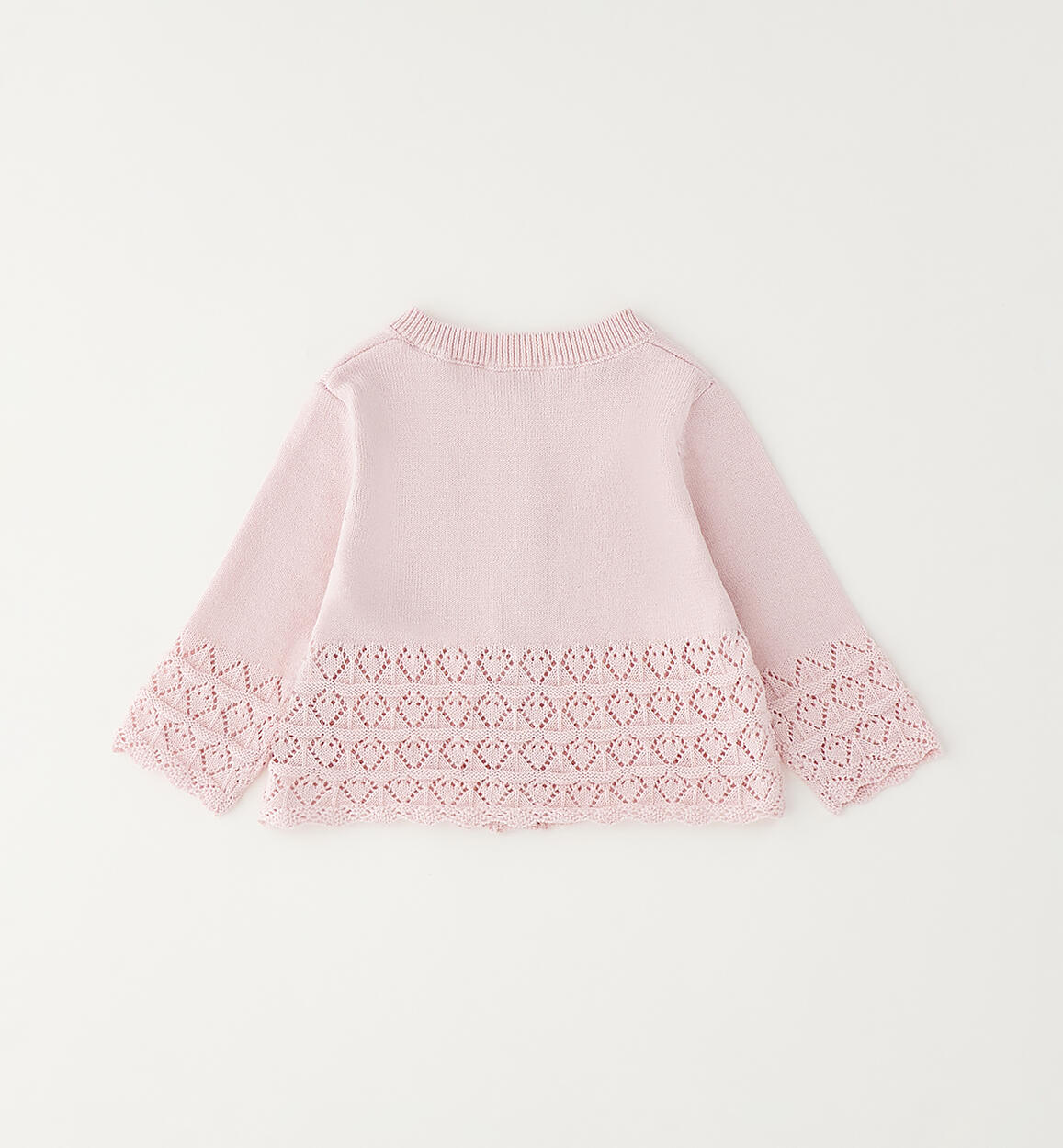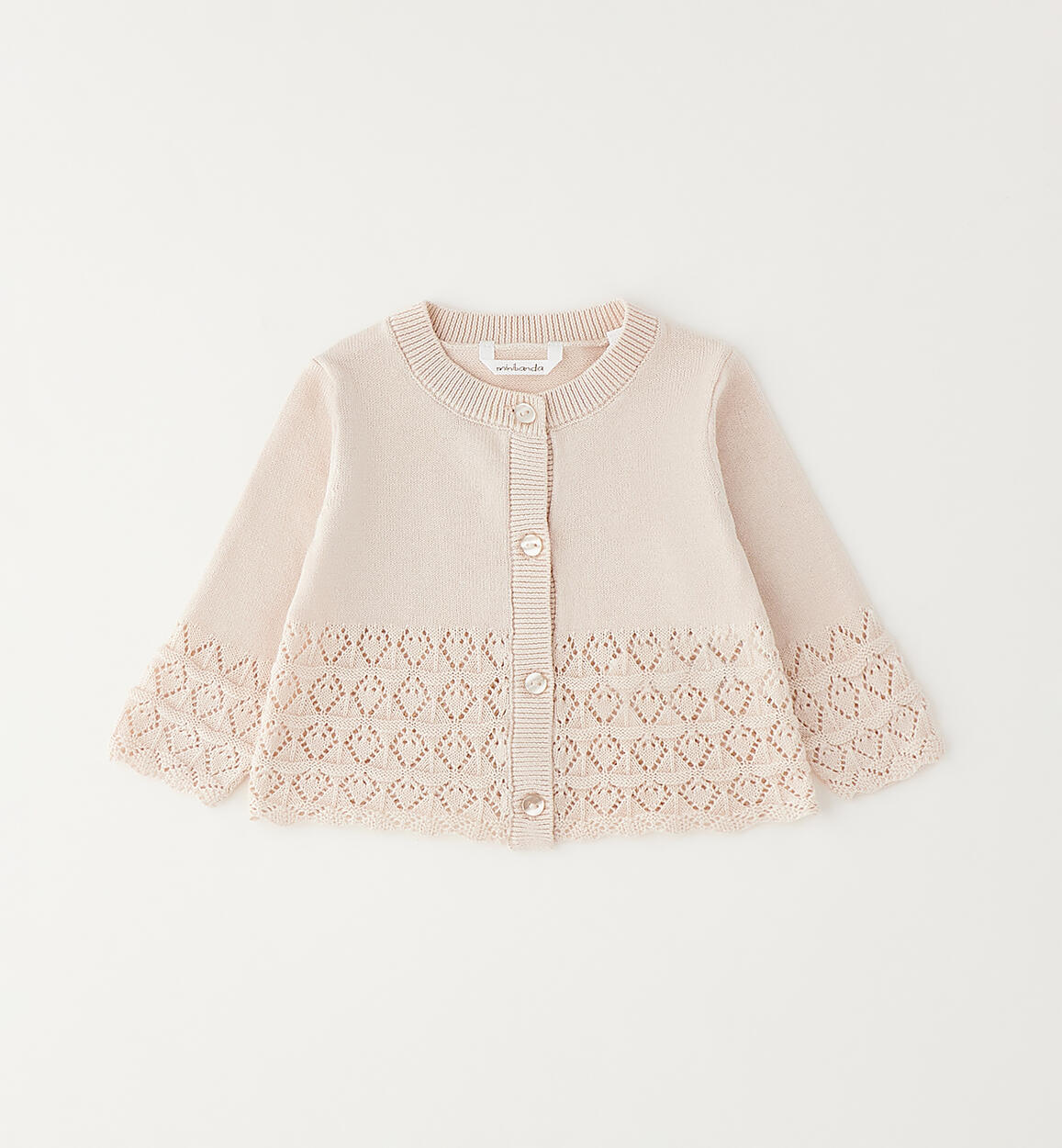 Minibanda girls' cardigan made of 100% cotton tricot with a lace hem. Button closure. By choosing our cotton products, you support Minibanda's commitment to the Better Cotton mission. This product is supplied through a mass balance system and may not contain Better Cotton. Learn more at bettercotton.org/massbalance