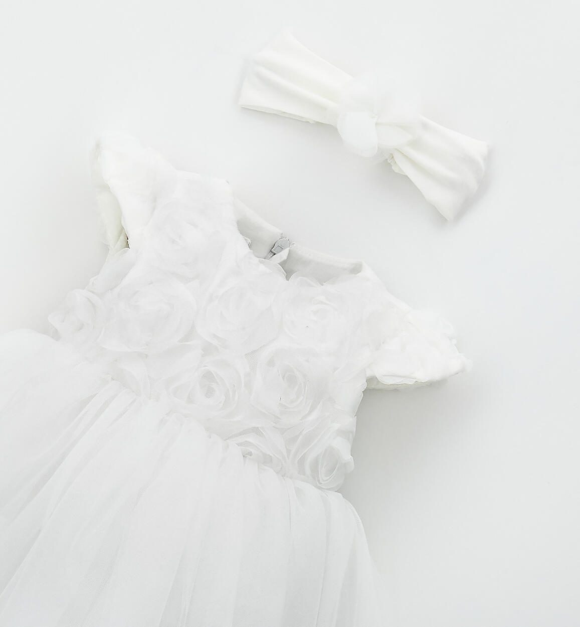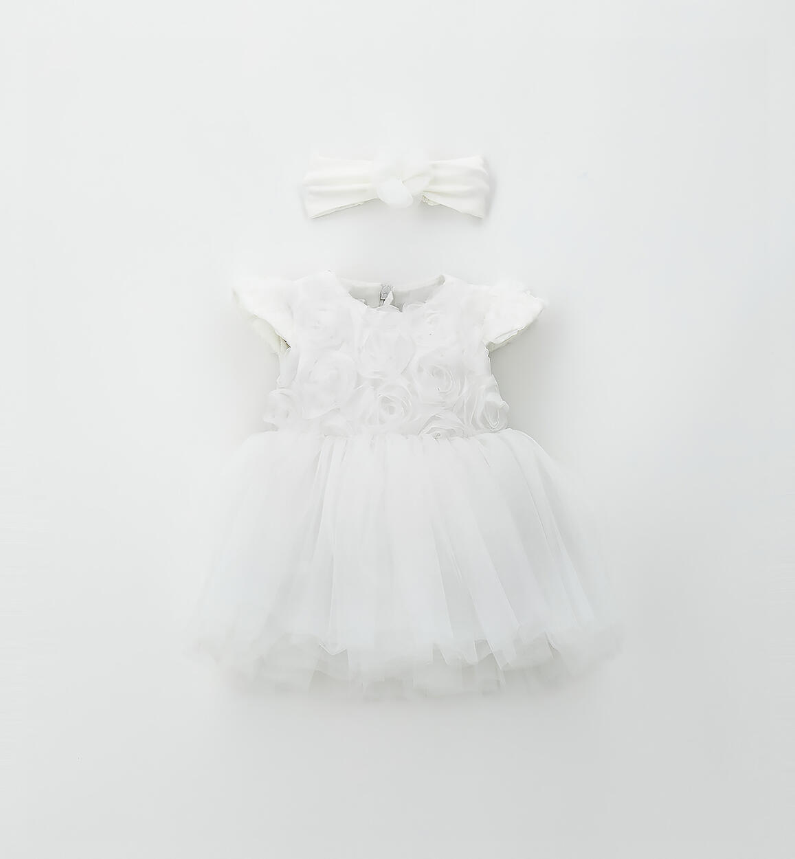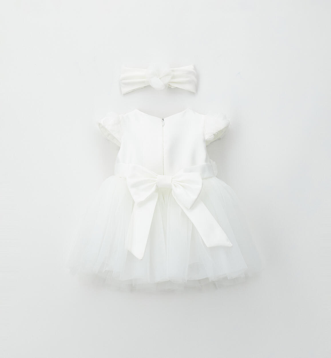 Elegant Minibanda dress for noenata made of tulle with cotton lining. Sleeveless, knee-length design. Bow at the back. Back opening with invisible zip. Lovely matching headband, made of cotton jersey with a tulle flower.