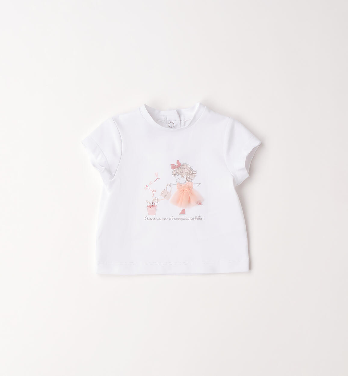 Minibanda baby girl's T-shirt made of stretch cotton jersey with a front print, glitter details, and a tulle applique. It opens at the back with snap buttons. By choosing our cotton products, you support Minibanda's commitment to the Better Cotton mission. This product is supplied through a mass balance system and may not contain Better Cotton. Learn more at bettercotton.org/massbalance