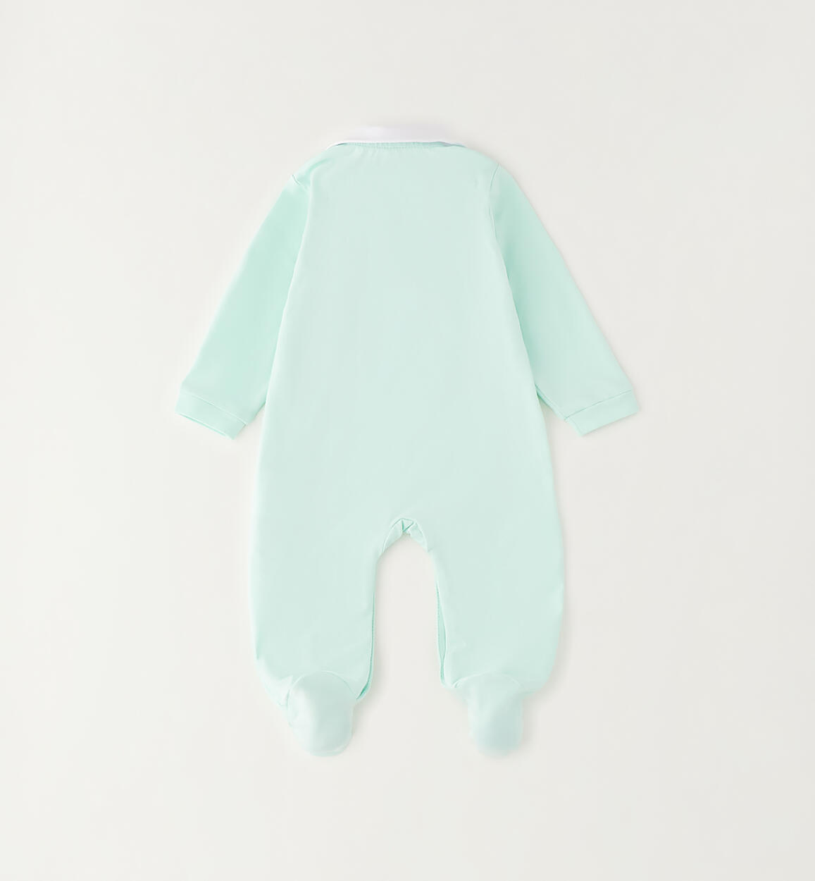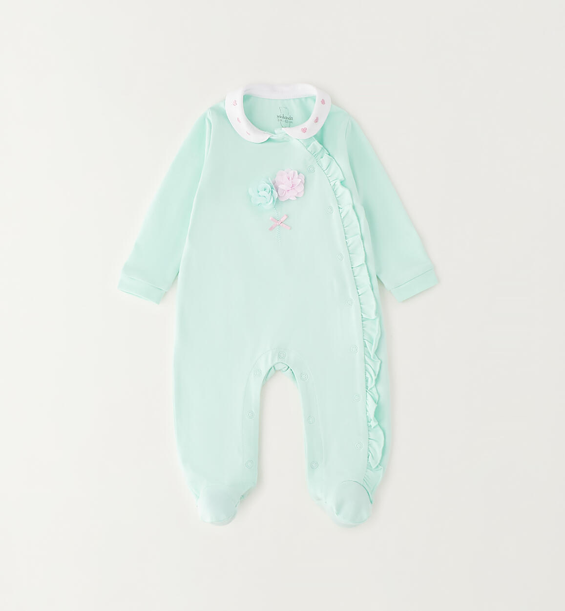 Minibanda baby girl's onesie with feet made of stretch cotton jersey. Appliqué flowers and a small bow on the front. The style features snap-button front and crotch openings for easy changing and dressing. By choosing our cotton products, you support Minibanda's commitment to the Better Cotton mission. This product is supplied through a mass balance system and may not contain Better Cotton. Learn more at bettercotton.org/massbalance