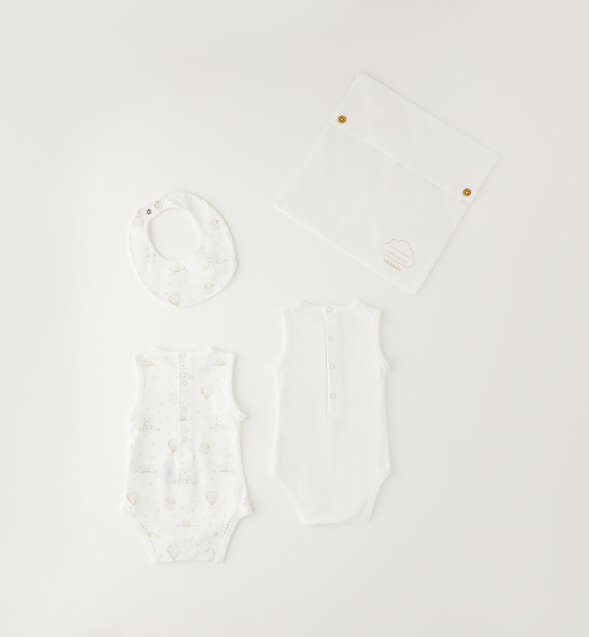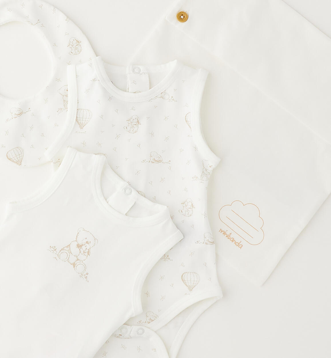Minibanda unisex cotton newborn kit. The set includes two bodysuits, a terrycloth bib, and a canvas pouch with a Minibanda logo print and a cloud for writing the baby's name. By choosing our cotton products, you support Minibanda's commitment to the Better Cotton mission. This product is supplied through a mass balance system and may not contain Better Cotton. Learn more at bettercotton.org/massbalanceComposition