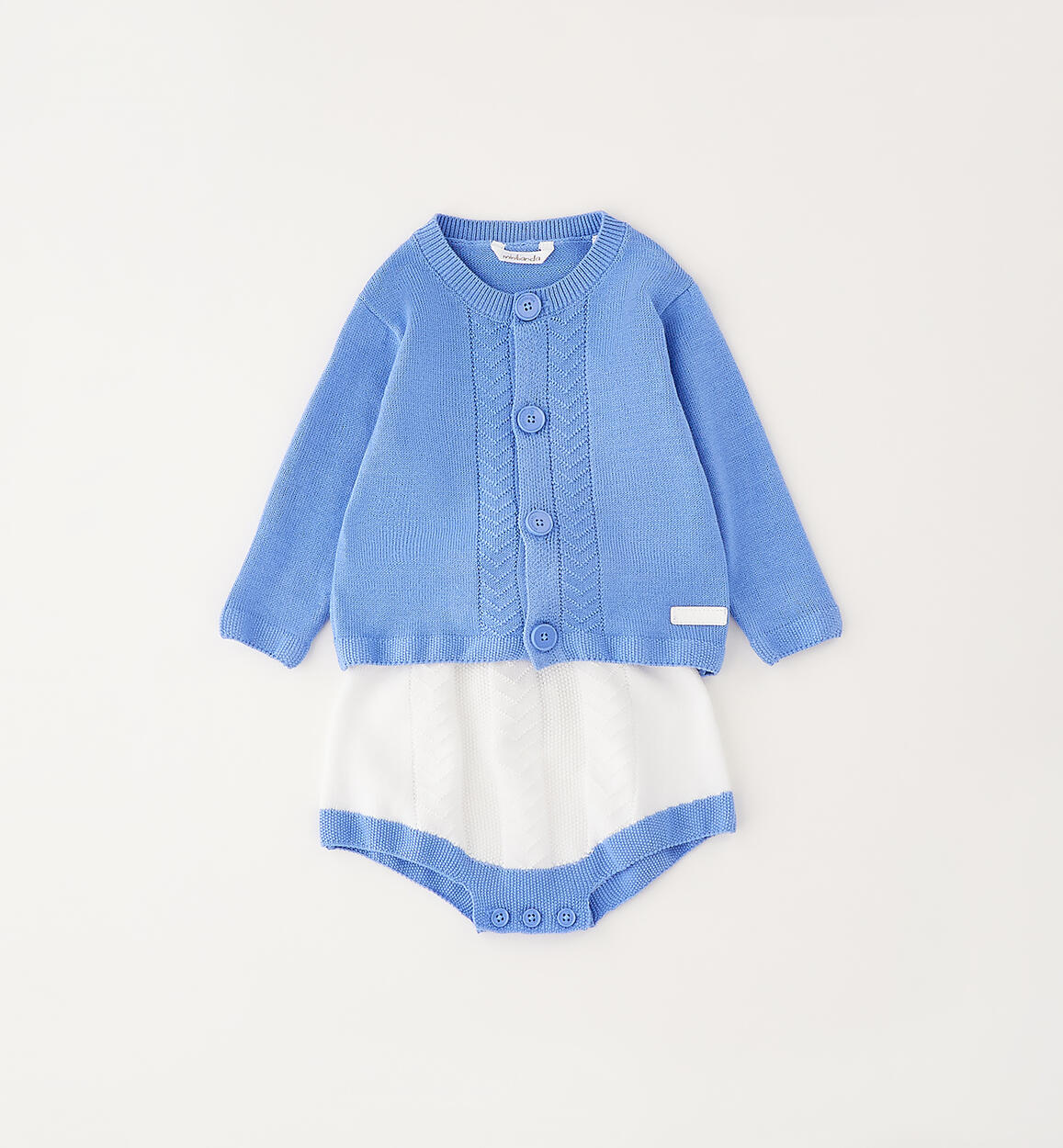 Minibanda baby boy's long-sleeved set made of 100% cotton tricot. Includes a front-opening cardigan and shorts with bibs. By choosing our cotton products, you support Minibanda's commitment to the Better Cotton mission. This product is supplied through a mass balance system and may not contain Better Cotton. Learn more at bettercotton.org/massbalance
