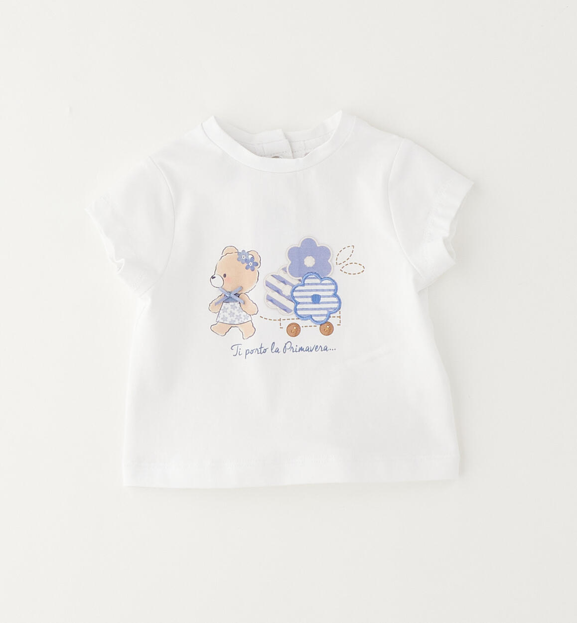 Minibanda baby girl's T-shirt made of stretch cotton jersey with a print and embroidered appliqué. It opens at the back with snap buttons. By choosing our cotton products, you support Minibanda's commitment to the Better Cotton mission. This product is supplied through a mass balance system and may not contain Better Cotton. Learn more at bettercotton.org/massbalance