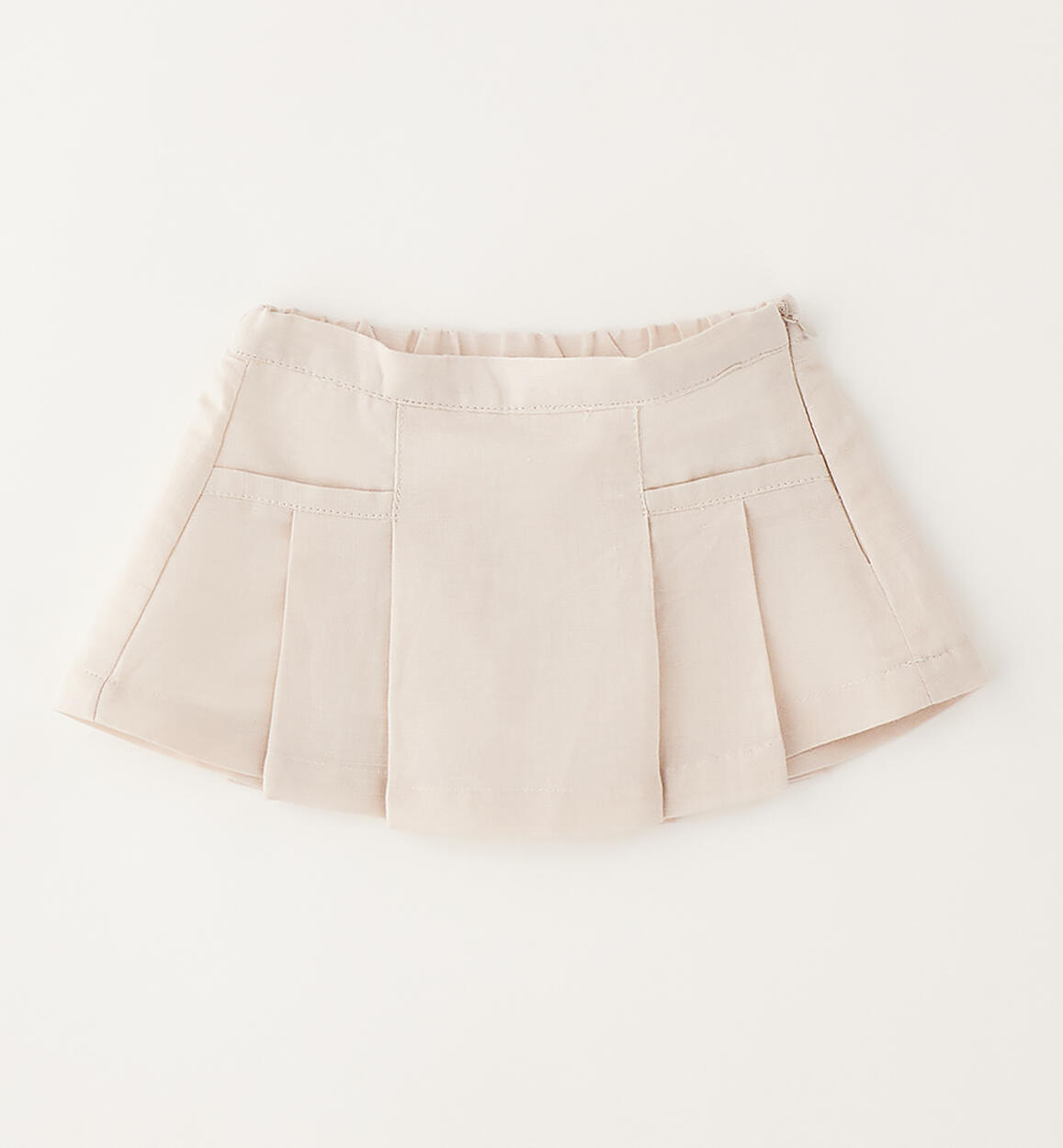 Minibanda baby skirt made of linen and cotton with a cotton lining. It features a side opening with an invisible zip, faux pockets, and a mini length.